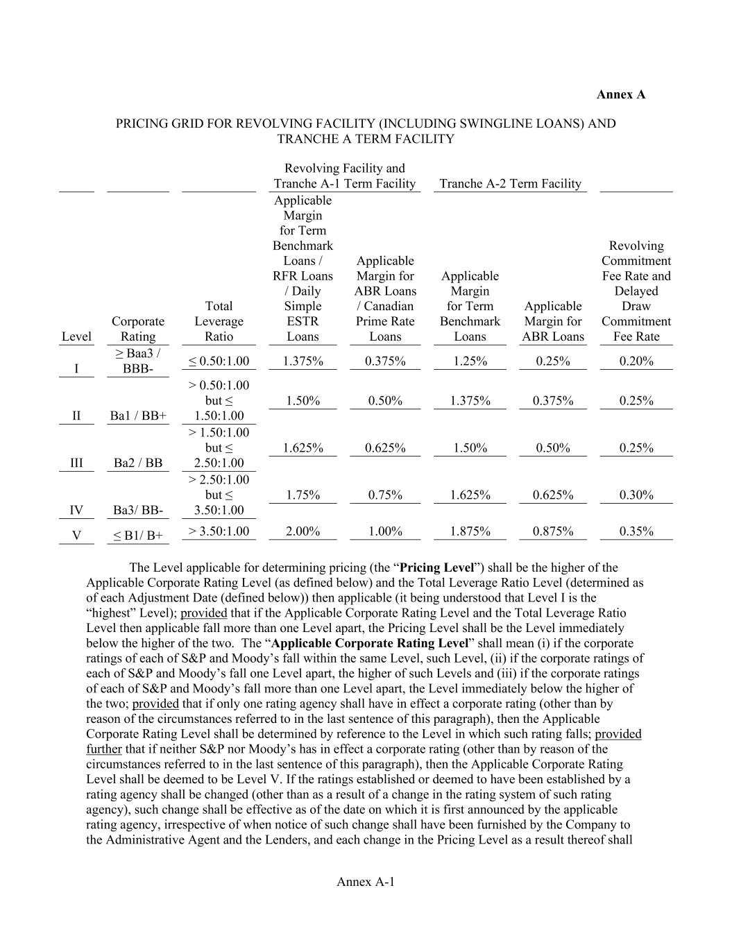 Annex A-1 Annex A PRICING GRID FOR REVOLVING FACILITY (INCLUDING SWINGLINE LOANS) AND TRANCHE A TERM FACILITY Revolving Facility and Tranche A-1 Term Facility Tranche A-2 Term Facility Level Corporate Rating Total Leverage Ratio Applicable Margin for Term Benchmark Loans / RFR Loans / Daily Simple ESTR Loans Applicable Margin for ABR Loans / Canadian Prime Rate Loans Applicable Margin for Term Benchmark Loans Applicable Margin for ABR Loans Revolving Commitment Fee Rate and Delayed Draw Commitment Fee Rate I ≥ Baa3 / BBB- ≤ 0.50:1.00 1.375% 0.375% 1.25% 0.25% 0.20% II Ba1 / BB+ > 0.50:1.00 but ≤ 1.50:1.00 1.50% 0.50% 1.375% 0.375% 0.25% III Ba2 / BB > 1.50:1.00 but ≤ 2.50:1.00 1.625% 0.625% 1.50% 0.50% 0.25% IV Ba3/ BB- > 2.50:1.00 but ≤ 3.50:1.00 1.75% 0.75% 1.625% 0.625% 0.30% V ≤ B1/ B+ > 3.50:1.00 2.00% 1.00% 1.875% 0.875% 0.35% The Level applicable for determining pricing (the “Pricing Level”) shall be the higher of the Applicable Corporate Rating Level (as defined below) and the Total Leverage Ratio Level (determined as of each Adjustment Date (defined below)) then applicable (it being understood that Level I is the “highest” Level); provided that if the Applicable Corporate Rating Level and the Total Leverage Ratio Level then applicable fall more than one Level apart, the Pricing Level shall be the Level immediately below the higher of the two. The “Applicable Corporate Rating Level” shall mean (i) if the corporate ratings of each of S&P and Moody’s fall within the same Level, such Level, (ii) if the corporate ratings of each of S&P and Moody’s fall one Level apart, the higher of such Levels and (iii) if the corporate ratings of each of S&P and Moody’s fall more than one Level apart, the Level immediately below the higher of the two; provided that if only one rating agency shall have in effect a corporate rating (other than by reason of the circumstances referred to in the last sentence of this paragraph), then the Applicable Corporate Rating Level shall be determined by reference to the Level in which such rating falls; provided further that if neither S&P nor Moody’s has in effect a corporate rating (other than by reason of the circumstances referred to in the last sentence of this paragraph), then the Applicable Corporate Rating Level shall be deemed to be Level V. If the ratings established or deemed to have been established by a rating agency shall be changed (other than as a result of a change in the rating system of such rating agency), such change shall be effective as of the date on which it is first announced by the applicable rating agency, irrespective of when notice of such change shall have been furnished by the Company to the Administrative Agent and the Lenders, and each change in the Pricing Level as a result thereof shall