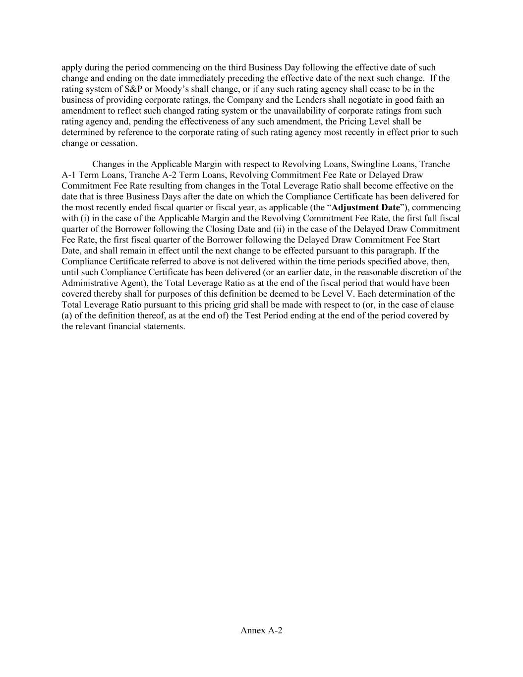 Annex A-2 apply during the period commencing on the third Business Day following the effective date of such change and ending on the date immediately preceding the effective date of the next such change. If the rating system of S&P or Moody’s shall change, or if any such rating agency shall cease to be in the business of providing corporate ratings, the Company and the Lenders shall negotiate in good faith an amendment to reflect such changed rating system or the unavailability of corporate ratings from such rating agency and, pending the effectiveness of any such amendment, the Pricing Level shall be determined by reference to the corporate rating of such rating agency most recently in effect prior to such change or cessation. Changes in the Applicable Margin with respect to Revolving Loans, Swingline Loans, Tranche A-1 Term Loans, Tranche A-2 Term Loans, Revolving Commitment Fee Rate or Delayed Draw Commitment Fee Rate resulting from changes in the Total Leverage Ratio shall become effective on the date that is three Business Days after the date on which the Compliance Certificate has been delivered for the most recently ended fiscal quarter or fiscal year, as applicable (the “Adjustment Date”), commencing with (i) in the case of the Applicable Margin and the Revolving Commitment Fee Rate, the first full fiscal quarter of the Borrower following the Closing Date and (ii) in the case of the Delayed Draw Commitment Fee Rate, the first fiscal quarter of the Borrower following the Delayed Draw Commitment Fee Start Date, and shall remain in effect until the next change to be effected pursuant to this paragraph. If the Compliance Certificate referred to above is not delivered within the time periods specified above, then, until such Compliance Certificate has been delivered (or an earlier date, in the reasonable discretion of the Administrative Agent), the Total Leverage Ratio as at the end of the fiscal period that would have been covered thereby shall for purposes of this definition be deemed to be Level V. Each determination of the Total Leverage Ratio pursuant to this pricing grid shall be made with respect to (or, in the case of clause (a) of the definition thereof, as at the end of) the Test Period ending at the end of the period covered by the relevant financial statements.