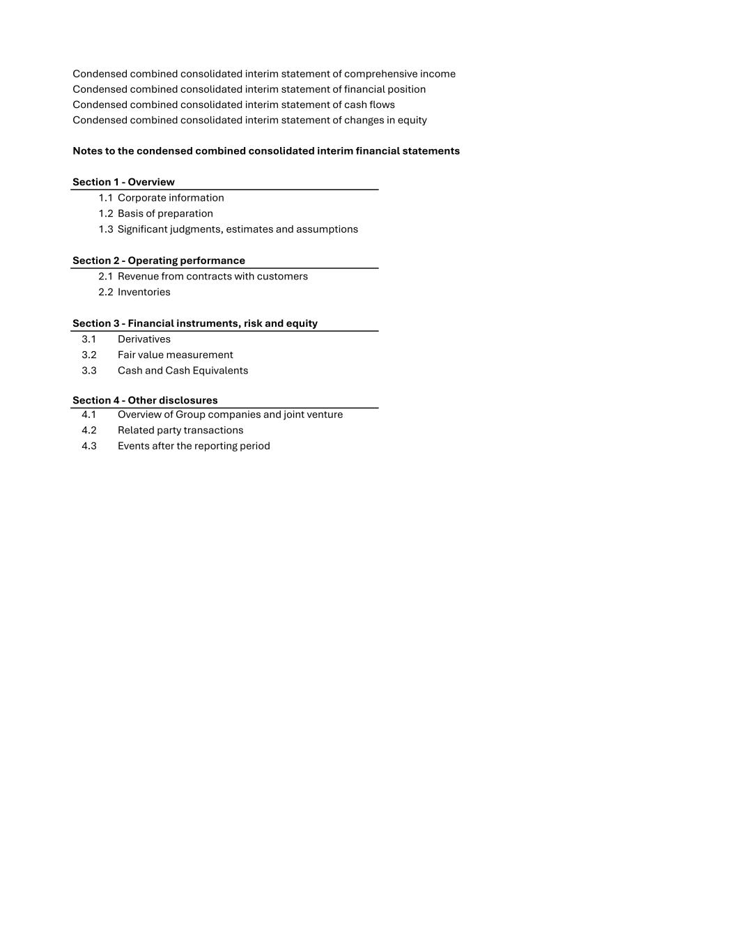 Condensed combined consolidated interim statement of comprehensive income Condensed combined consolidated interim statement of financial position Condensed combined consolidated interim statement of cash flows Condensed combined consolidated interim statement of changes in equity Notes to the condensed combined consolidated interim financial statements Section 1 - Overview 1.1 Corporate information 1.2 Basis of preparation 1.3 Significant judgments, estimates and assumptions Section 2 - Operating performance 2.1 Revenue from contracts with customers 2.2 Inventories Section 3 - Financial instruments, risk and equity 3.1 Derivatives 3.2 Fair value measurement 3.3 Cash and Cash Equivalents Section 4 - Other disclosures 4.1 Overview of Group companies and joint venture 4.2 Related party transactions 4.3 Events after the reporting period