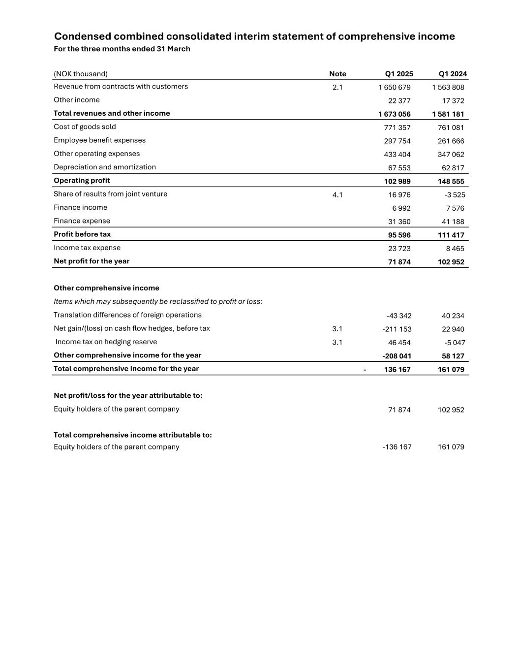 Condensed combined consolidated interim statement of comprehensive income (NOK thousand) Note Q1 2025 Q1 2024 Revenue from contracts with customers 2.1 1 650 679 1 563 808 Other income 22 377 17 372 Total revenues and other income 1 673 056 1 581 181 Cost of goods sold 771 357 761 081 Employee benefit expenses 297 754 261 666 Other operating expenses 433 404 347 062 Depreciation and amortization 67 553 62 817 Operating profit 102 989 148 555 Share of results from joint venture 4.1 16 976 -3 525 Finance income 6 992 7 576 Finance expense 31 360 41 188 Profit before tax 95 596 111 417 Income tax expense 23 723 8 465 Net profit for the year 71 874 102 952 Other comprehensive income Items which may subsequently be reclassified to profit or loss: Translation differences of foreign operations -43 342 40 234 Net gain/(loss) on cash flow hedges, before tax 3.1 -211 153 22 940 Income tax on hedging reserve 3.1 46 454 -5 047 Other comprehensive income for the year -208 041 58 127 Total comprehensive income for the year 136 167- 161 079 Net profit/loss for the year attributable to: Equity holders of the parent company 71 874 102 952 Total comprehensive income attributable to: Equity holders of the parent company -136 167 161 079 For the three months ended 31 March