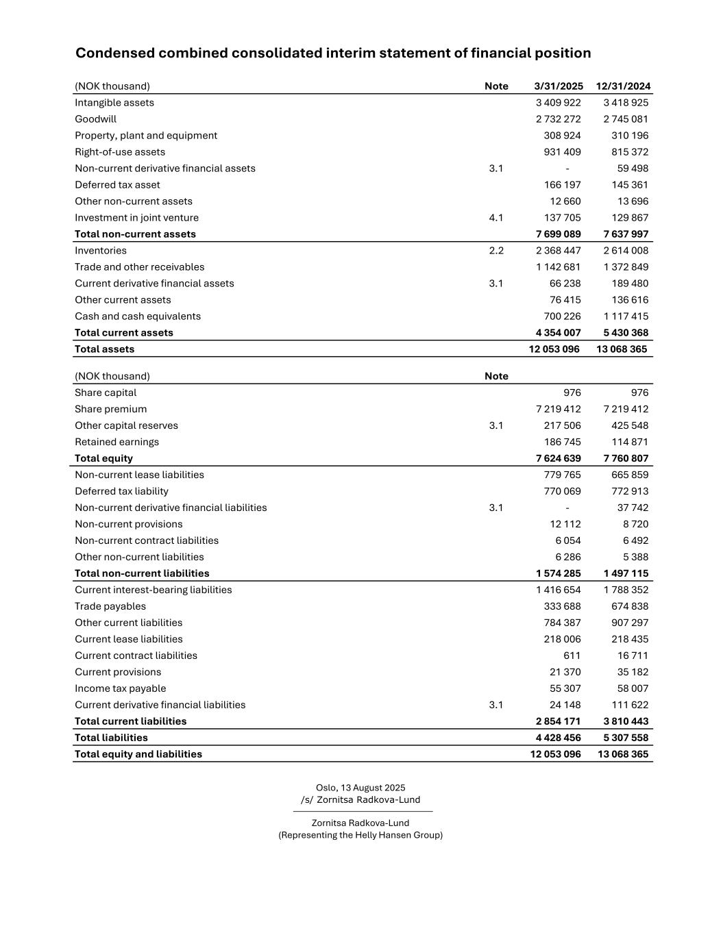 Condensed combined consolidated interim statement of financial position (NOK thousand) Note 3/31/2025 12/31/2024 Intangible assets 3 409 922 3 418 925 Goodwill 2 732 272 2 745 081 Property, plant and equipment 308 924 310 196 Right-of-use assets 931 409 815 372 Non-current derivative financial assets 3.1 - 59 498 Deferred tax asset 166 197 145 361 Other non-current assets 12 660 13 696 Investment in joint venture 4.1 137 705 129 867 Total non-current assets 7 699 089 7 637 997 Inventories 2.2 2 368 447 2 614 008 Trade and other receivables 1 142 681 1 372 849 Current derivative financial assets 3.1 66 238 189 480 Other current assets 76 415 136 616 Cash and cash equivalents 700 226 1 117 415 Total current assets 4 354 007 5 430 368 Total assets 12 053 096 13 068 365 (NOK thousand) Note Share capital 976 976 Share premium 7 219 412 7 219 412 Other capital reserves 3.1 217 506 425 548 Retained earnings 186 745 114 871 Total equity 7 624 639 7 760 807 Non-current lease liabilities 779 765 665 859 Deferred tax liability 770 069 772 913 Non-current derivative financial liabilities 3.1 - 37 742 Non-current provisions 12 112 8 720 Non-current contract liabilities 6 054 6 492 Other non-current liabilities 6 286 5 388 Total non-current liabilities 1 574 285 1 497 115 Current interest-bearing liabilities 1 416 654 1 788 352 Trade payables 333 688 674 838 Other current liabilities 784 387 907 297 Current lease liabilities 218 006 218 435 Current contract liabilities 611 16 711 Current provisions 21 370 35 182 Income tax payable 55 307 58 007 Current derivative financial liabilities 3.1 24 148 111 622 Total current liabilities 2 854 171 3 810 443 Total liabilities 4 428 456 5 307 558 Total equity and liabilities 12 053 096 13 068 365 Oslo, 13 August 2025 /s/ Zornitsa Radkova-Lund Zornitsa Radkova-Lund (Representing the Helly Hansen Group)