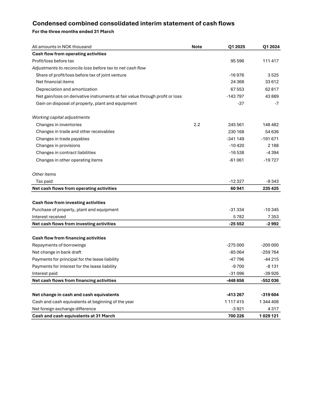 Condensed combined consolidated interim statement of cash flows All amounts in NOK thousand Note Q1 2025 Q1 2024 Cash flow from operating activities Profit/loss before tax 95 596 111 417 Adjustments to reconcile loss before tax to net cash flow Share of profit/loss before tax of joint venture -16 976 3 525 Net financial items 24 368 33 612 Depreciation and amortization 67 553 62 817 Net gain/loss on derivative instruments at fair value through profit or loss -143 797 43 889 Gain on disposal of property, plant and equipment -37 -7 Working capital adjustments Changes in inventories 2.2 245 561 148 482 Changes in trade and other receivables 230 168 54 636 Changes in trade payables -341 149 -191 671 Changes in provisions -10 420 2 188 Changes in contract liabilities -16 538 -4 394 Changes in other operating items -61 061 -19 727 Other items Tax paid -12 327 -9 343 Net cash flows from operating activities 60 941 235 425 Cash flow from investing activities Purchase of property, plant and equipment -31 334 -10 345 Interest received 5 782 7 353 Net cash flows from investing activities -25 552 -2 992 Cash flow from financing activities Repayments of borrowings -275 000 -200 000 Net change in bank draft -85 064 -259 764 Payments for principal for the lease liability -47 796 -44 215 Payments for interest for the lease liability -9 700 -8 131 Interest paid -31 096 -39 926 Net cash flows from financing activities -448 656 -552 036 Net change in cash and cash equivalents -413 267 -319 604 Cash and cash equivalents at beginning of the year 1 117 415 1 344 408 Net foreign exchange difference -3 921 4 317 Cash and cash equivalents at 31 March 700 226 1 029 121 For the three months ended 31 March