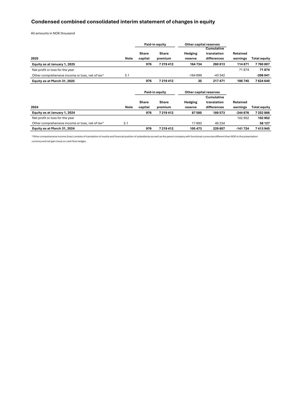 Condensed combined consolidated interim statement of changes in equity All amounts in NOK thousand 2025 Note Share capital Share premium Hedging reserve Cumulative translation differences Retained earnings Total equity Equity as at January 1, 2025 976 7 219 412 164 734 260 813 114 871 7 760 807 Net profit or loss for the year 71 874 71 874 Other comprehensive income or loss, net of tax* 3.1 -164 699 -43 342 -208 041 Equity as at March 31, 2025 976 7 219 412 35 217 471 186 745 7 624 640 2024 Note Share capital Share premium Hedging reserve Cumulative translation differences Retained earnings Total equity Equity as at January 1, 2024 976 7 219 412 87 580 189 573 -244 676 7 252 866 Net profit or loss for the year 102 952 102 952 Other comprehensive income or loss, net of tax* 3.1 17 893 40 234 58 127 Equity as at March 31, 2024 976 7 219 412 105 473 229 807 -141 724 7 413 945 Paid-in equity Paid-in equity Other capital reserves Other capital reserves *Other comprehensive income (loss) consists of translation of results and financial position of subsidiaries as well as the parent company with functional currencies different than NOK to the presentation currency and net gain (loss) on cash flow hedges.