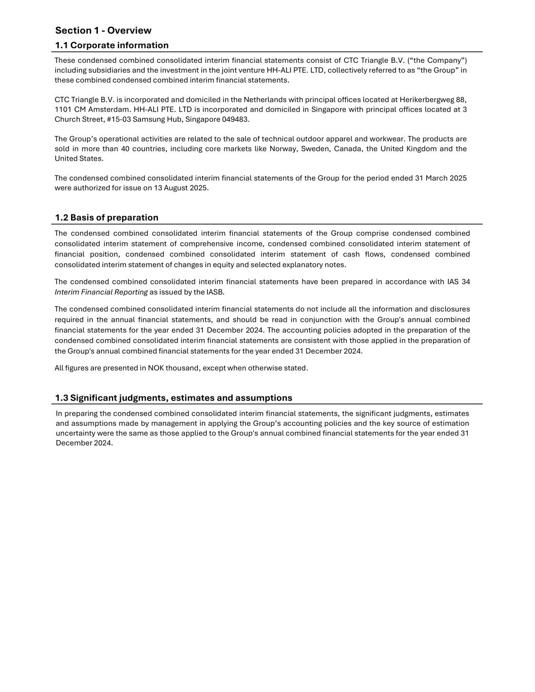 Section 1 - Overview 1.1 Corporate information 1.2 Basis of preparation 1.3 Significant judgments, estimates and assumptions These condensed combined consolidated interim financial statements consist of CTC Triangle B.V. (“the Company”) including subsidiaries and the investment in the joint venture HH-ALI PTE. LTD, collectively referred to as “the Group” in these combined condensed combined interim financial statements. CTC Triangle B.V. is incorporated and domiciled in the Netherlands with principal offices located at Herikerbergweg 88, 1101 CM Amsterdam. HH-ALI PTE. LTD is incorporated and domiciled in Singapore with principal offices located at 3 Church Street, #15-03 Samsung Hub, Singapore 049483. The Group’s operational activities are related to the sale of technical outdoor apparel and workwear. The products are sold in more than 40 countries, including core markets like Norway, Sweden, Canada, the United Kingdom and the United States. The condensed combined consolidated interim financial statements of the Group for the period ended 31 March 2025 were authorized for issue on 13 August 2025. The condensed combined consolidated interim financial statements of the Group comprise condensed combined consolidated interim statement of comprehensive income, condensed combined consolidated interim statement of financial position, condensed combined consolidated interim statement of cash flows, condensed combined consolidated interim statement of changes in equity and selected explanatory notes. The condensed combined consolidated interim financial statements have been prepared in accordance with IAS 34 Interim Financial Reporting as issued by the IASB. The condensed combined consolidated interim financial statements do not include all the information and disclosures required in the annual financial statements, and should be read in conjunction with the Group's annual combined financial statements for the year ended 31 December 2024. The accounting policies adopted in the preparation of the condensed combined consolidated interim financial statements are consistent with those applied in the preparation of the Group's annual combined financial statements for the year ended 31 December 2024. All figures are presented in NOK thousand, except when otherwise stated. In preparing the condensed combined consolidated interim financial statements, the significant judgments, estimates and assumptions made by management in applying the Group’s accounting policies and the key source of estimation uncertainty were the same as those applied to the Group's annual combined financial statements for the year ended 31 December 2024.