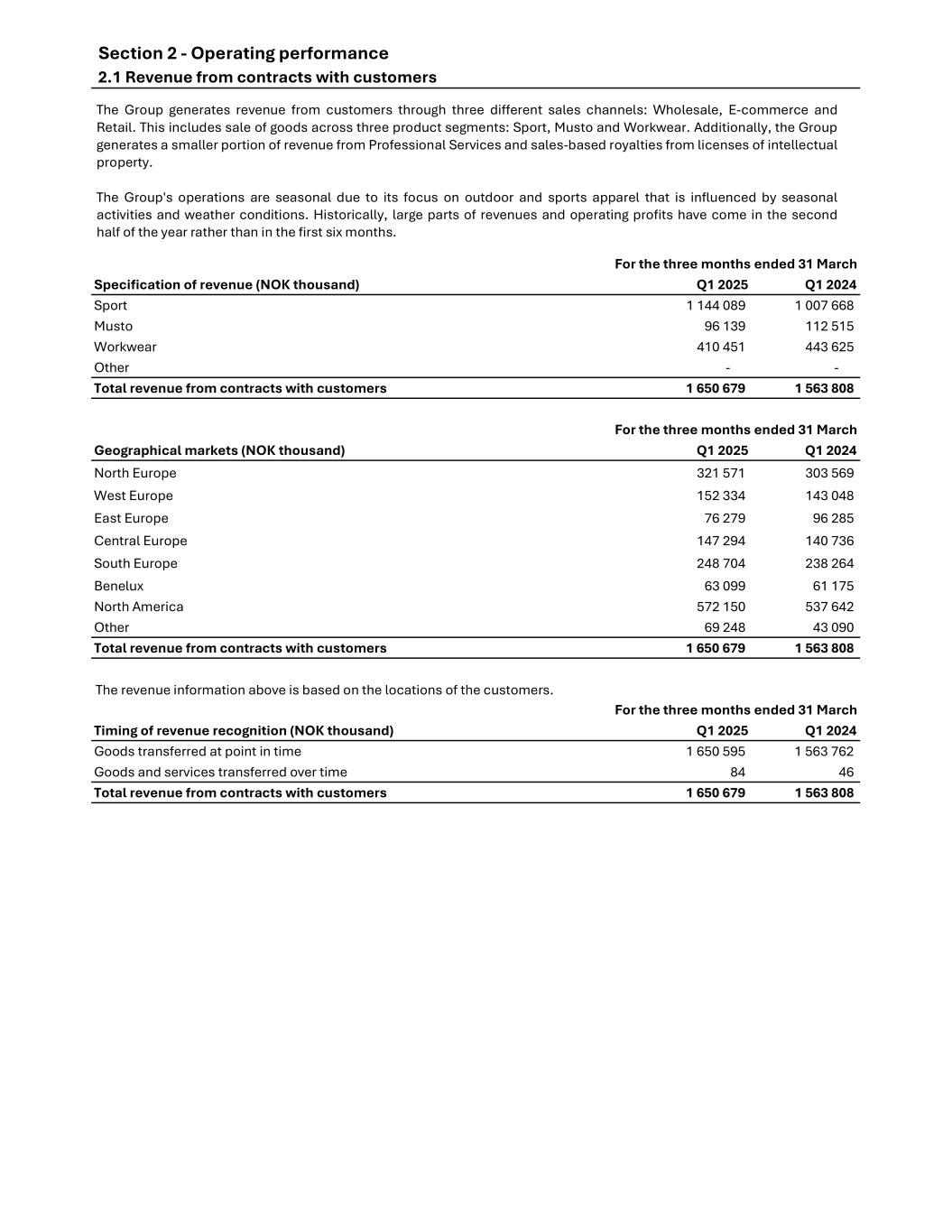 Section 2 - Operating performance 2.1 Revenue from contracts with customers Specification of revenue (NOK thousand) Q1 2025 Q1 2024 Sport 1 144 089 1 007 668 Musto 96 139 112 515 Workwear 410 451 443 625 Other - - Total revenue from contracts with customers 1 650 679 1 563 808 Geographical markets (NOK thousand) Q1 2025 Q1 2024 North Europe 321 571 303 569 West Europe 152 334 143 048 East Europe 76 279 96 285 Central Europe 147 294 140 736 South Europe 248 704 238 264 Benelux 63 099 61 175 North America 572 150 537 642 Other 69 248 43 090 Total revenue from contracts with customers 1 650 679 1 563 808 Timing of revenue recognition (NOK thousand) Q1 2025 Q1 2024 Goods transferred at point in time 1 650 595 1 563 762 Goods and services transferred over time 84 46 Total revenue from contracts with customers 1 650 679 1 563 808 For the three months ended 31 March For the three months ended 31 March For the three months ended 31 March The Group generates revenue from customers through three different sales channels: Wholesale, E-commerce and Retail. This includes sale of goods across three product segments: Sport, Musto and Workwear. Additionally, the Group generates a smaller portion of revenue from Professional Services and sales-based royalties from licenses of intellectual property. The Group's operations are seasonal due to its focus on outdoor and sports apparel that is influenced by seasonal activities and weather conditions. Historically, large parts of revenues and operating profits have come in the second half of the year rather than in the first six months. The revenue information above is based on the locations of the customers.