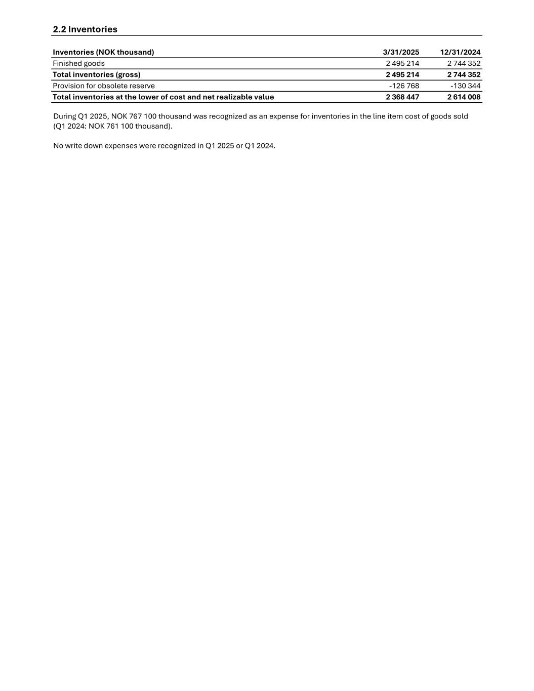 2.2 Inventories Inventories (NOK thousand) 3/31/2025 12/31/2024 Finished goods 2 495 214 2 744 352 Total inventories (gross) 2 495 214 2 744 352 Provision for obsolete reserve -126 768 -130 344 Total inventories at the lower of cost and net realizable value 2 368 447 2 614 008 During Q1 2025, NOK 767 100 thousand was recognized as an expense for inventories in the line item cost of goods sold (Q1 2024: NOK 761 100 thousand). No write down expenses were recognized in Q1 2025 or Q1 2024.