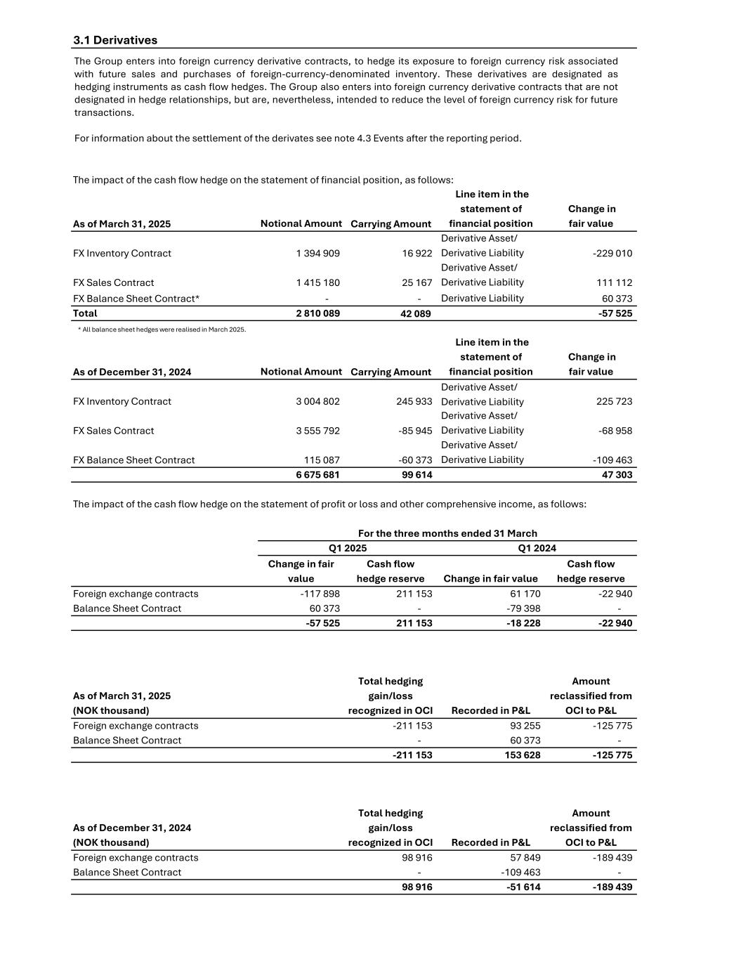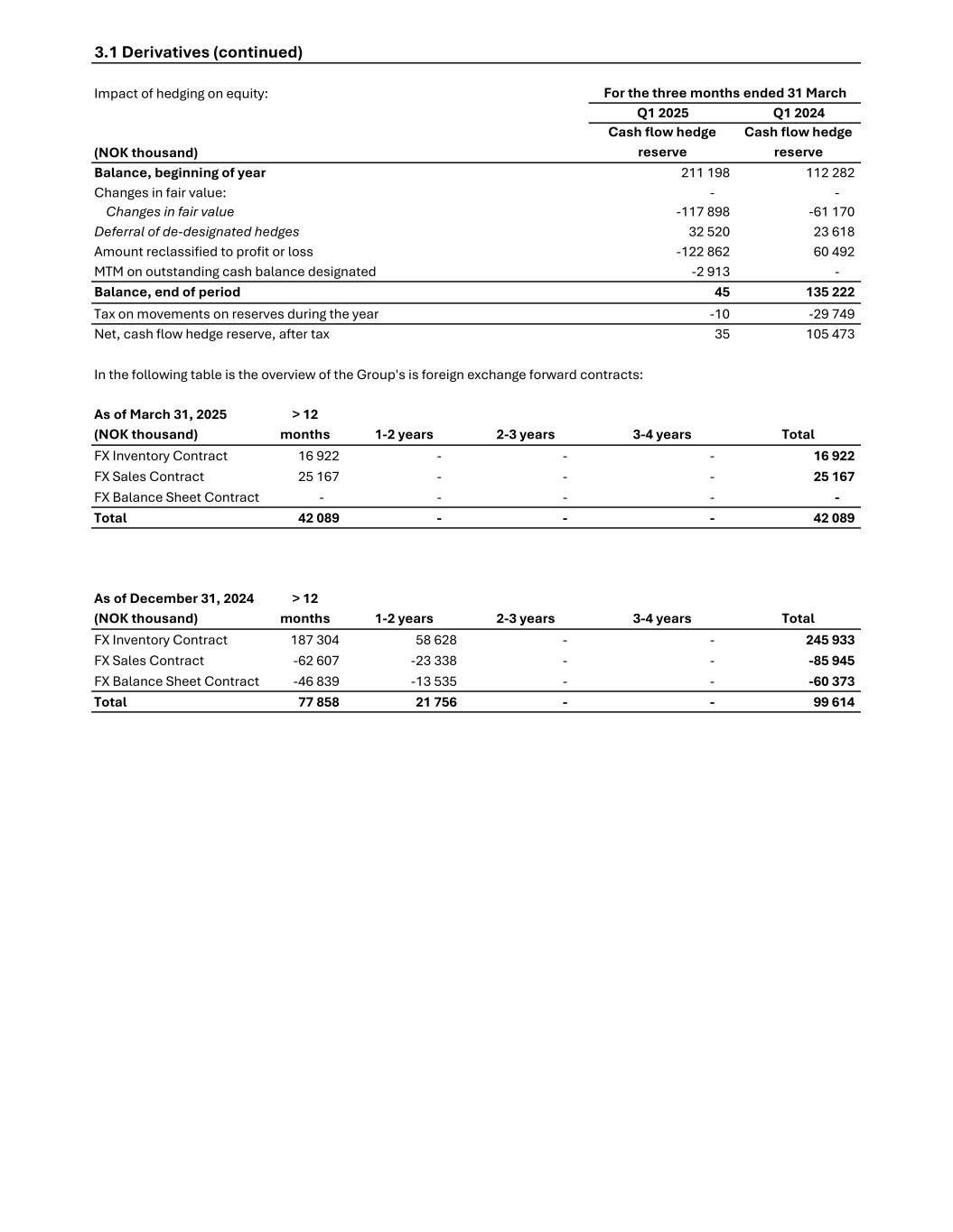 3.1 Derivatives (continued) Impact of hedging on equity: Q1 2025 Q1 2024 (NOK thousand) Cash flow hedge reserve Cash flow hedge reserve Balance, beginning of year 211 198 112 282 Changes in fair value: - - Changes in fair value -117 898 -61 170 Deferral of de-designated hedges 32 520 23 618 Amount reclassified to profit or loss -122 862 60 492 MTM on outstanding cash balance designated -2 913 - Balance, end of period 45 135 222 Tax on movements on reserves during the year -10 -29 749 Net, cash flow hedge reserve, after tax 35 105 473 In the following table is the overview of the Group's is foreign exchange forward contracts: As of March 31, 2025 (NOK thousand) > 12 months 1-2 years 2-3 years 3-4 years Total FX Inventory Contract 16 922 - - - 16 922 FX Sales Contract 25 167 - - - 25 167 FX Balance Sheet Contract - - - - - Total 42 089 - - - 42 089 As of December 31, 2024 (NOK thousand) > 12 months 1-2 years 2-3 years 3-4 years Total FX Inventory Contract 187 304 58 628 - - 245 933 FX Sales Contract -62 607 -23 338 - - -85 945 FX Balance Sheet Contract -46 839 -13 535 - - -60 373 Total 77 858 21 756 - - 99 614 For the three months ended 31 March