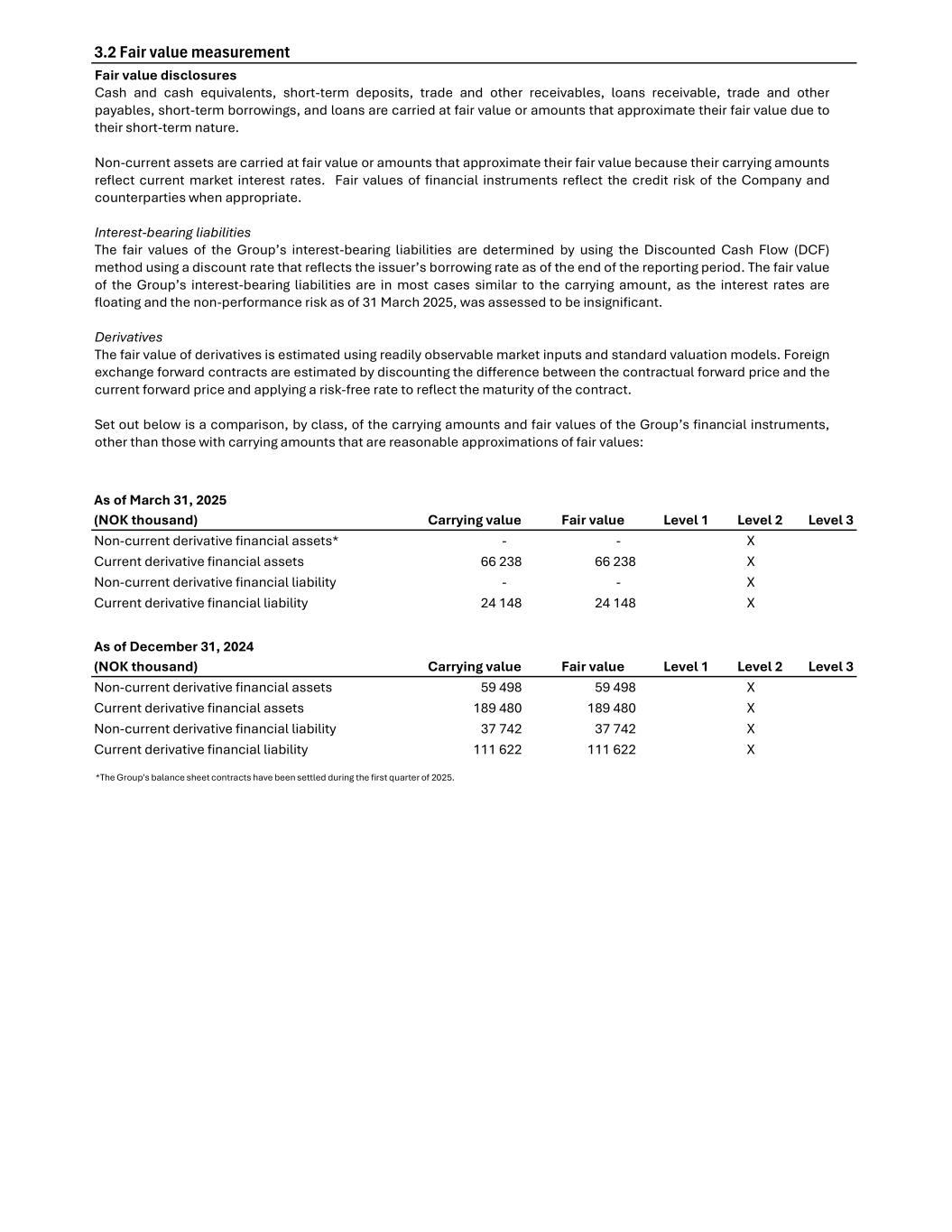 3.2 Fair value measurement Carrying value Fair value Level 1 Level 2 Level 3 Non-current derivative financial assets* - - X Current derivative financial assets 66 238 66 238 X Non-current derivative financial liability - - X Current derivative financial liability 24 148 24 148 X Carrying value Fair value Level 1 Level 2 Level 3 Non-current derivative financial assets 59 498 59 498 X Current derivative financial assets 189 480 189 480 X Non-current derivative financial liability 37 742 37 742 X Current derivative financial liability 111 622 111 622 X As of December 31, 2024 (NOK thousand) As of March 31, 2025 (NOK thousand) Fair value disclosures Cash and cash equivalents, short-term deposits, trade and other receivables, loans receivable, trade and other payables, short-term borrowings, and loans are carried at fair value or amounts that approximate their fair value due to their short-term nature. Non-current assets are carried at fair value or amounts that approximate their fair value because their carrying amounts reflect current market interest rates. Fair values of financial instruments reflect the credit risk of the Company and counterparties when appropriate. Interest-bearing liabilities The fair values of the Group’s interest-bearing liabilities are determined by using the Discounted Cash Flow (DCF) method using a discount rate that reflects the issuer’s borrowing rate as of the end of the reporting period. The fair value of the Group’s interest-bearing liabilities are in most cases similar to the carrying amount, as the interest rates are floating and the non-performance risk as of 31 March 2025, was assessed to be insignificant. Derivatives The fair value of derivatives is estimated using readily observable market inputs and standard valuation models. Foreign exchange forward contracts are estimated by discounting the difference between the contractual forward price and the current forward price and applying a risk-free rate to reflect the maturity of the contract. Set out below is a comparison, by class, of the carrying amounts and fair values of the Group’s financial instruments, other than those with carrying amounts that are reasonable approximations of fair values: *The Group's balance sheet contracts have been settled during the first quarter of 2025.