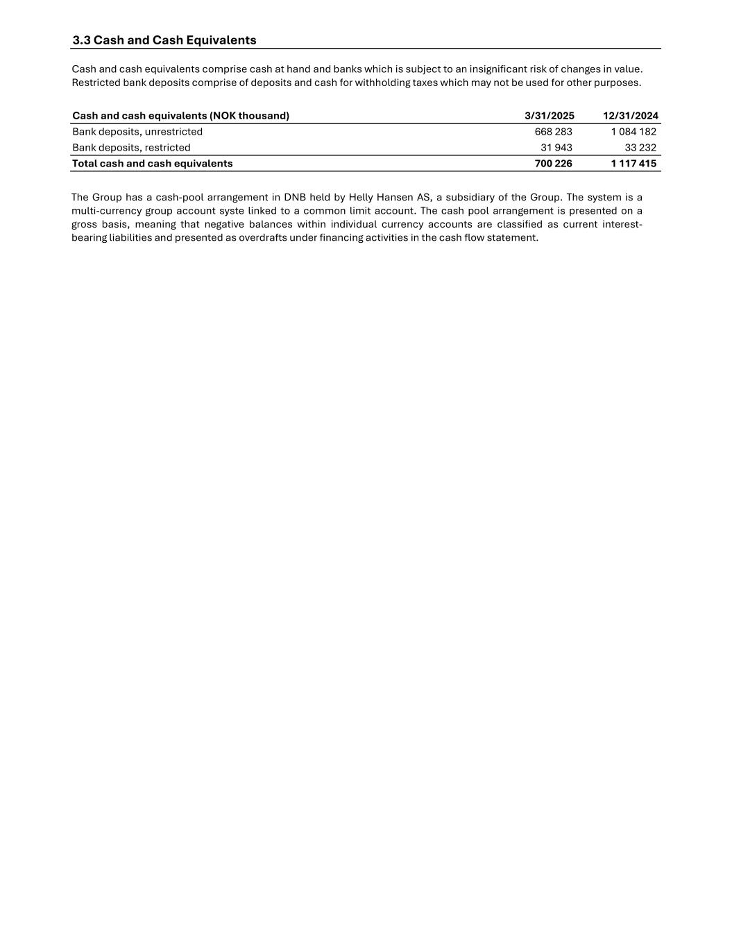 3.3 Cash and Cash Equivalents Cash and cash equivalents (NOK thousand) 3/31/2025 12/31/2024 Bank deposits, unrestricted 668 283 1 084 182 Bank deposits, restricted 31 943 33 232 Total cash and cash equivalents 700 226 1 117 415 Cash and cash equivalents comprise cash at hand and banks which is subject to an insignificant risk of changes in value. Restricted bank deposits comprise of deposits and cash for withholding taxes which may not be used for other purposes. The Group has a cash-pool arrangement in DNB held by Helly Hansen AS, a subsidiary of the Group. The system is a multi-currency group account syste linked to a common limit account. The cash pool arrangement is presented on a gross basis, meaning that negative balances within individual currency accounts are classified as current interest- bearing liabilities and presented as overdrafts under financing activities in the cash flow statement.