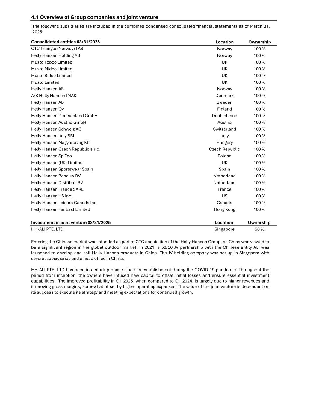 4.1 Overview of Group companies and joint venture Consolidated entities 03/31/2025 Location Ownership CTC Triangle (Norway) I AS Norway 100 % Helly Hansen Holding AS Norway 100 % Musto Topco Limited UK 100 % Musto Midco Limited UK 100 % Musto Bidco Limited UK 100 % Musto Limited UK 100 % Helly Hansen AS Norway 100 % A/S Helly Hansen IMAK Denmark 100 % Helly Hansen AB Sweden 100 % Helly Hansen Oy Finland 100 % Helly Hansen Deutschland GmbH Deutschland 100 % Helly Hansen Austria GmbH Austria 100 % Helly Hansen Schweiz AG Switzerland 100 % Helly Hansen Italy SRL Italy 100 % Helly Hansen Magyarorzag Kft Hungary 100 % Helly Hansen Czech Republic s.r.o. Czech Republic 100 % Helly Hansen Sp Zoo Poland 100 % Helly Hansen (UK) Limited UK 100 % Helly Hansen Sportswear Spain Spain 100 % Helly Hansen Benelux BV Netherland 100 % Helly Hansen Distributi BV Netherland 100 % Helly Hansen France SARL France 100 % Helly Hansen US Inc. US 100 % Helly Hansen Leisure Canada Inc. Canada 100 % Helly Hansen Far East Limited Hong Kong 100 % Investment in joint venture 03/31/2025 Location Ownership HH-ALI PTE. LTD Singapore 50 % The following subsidiaries are included in the combined condensed consolidated financial statements as of March 31, 2025: Entering the Chinese market was intended as part of CTC acquisition of the Helly Hansen Group, as China was viewed to be a significant region in the global outdoor market. In 2021, a 50/50 JV partnership with the Chinese entity ALI was launched to develop and sell Helly Hansen products in China. The JV holding company was set up in Singapore with several subsidiaries and a head office in China. HH-ALI PTE. LTD has been in a startup phase since its establishment during the COVID-19 pandemic. Throughout the period from inception, the owners have infused new capital to offset initial losses and ensure essential investment capabilities. The improved profitability in Q1 2025, when compared to Q1 2024, is largely due to higher revenues and improving gross margins, somewhat offset by higher operating expenses. The value of the joint venture is dependent on its success to execute its strategy and meeting expectations for continued growth.