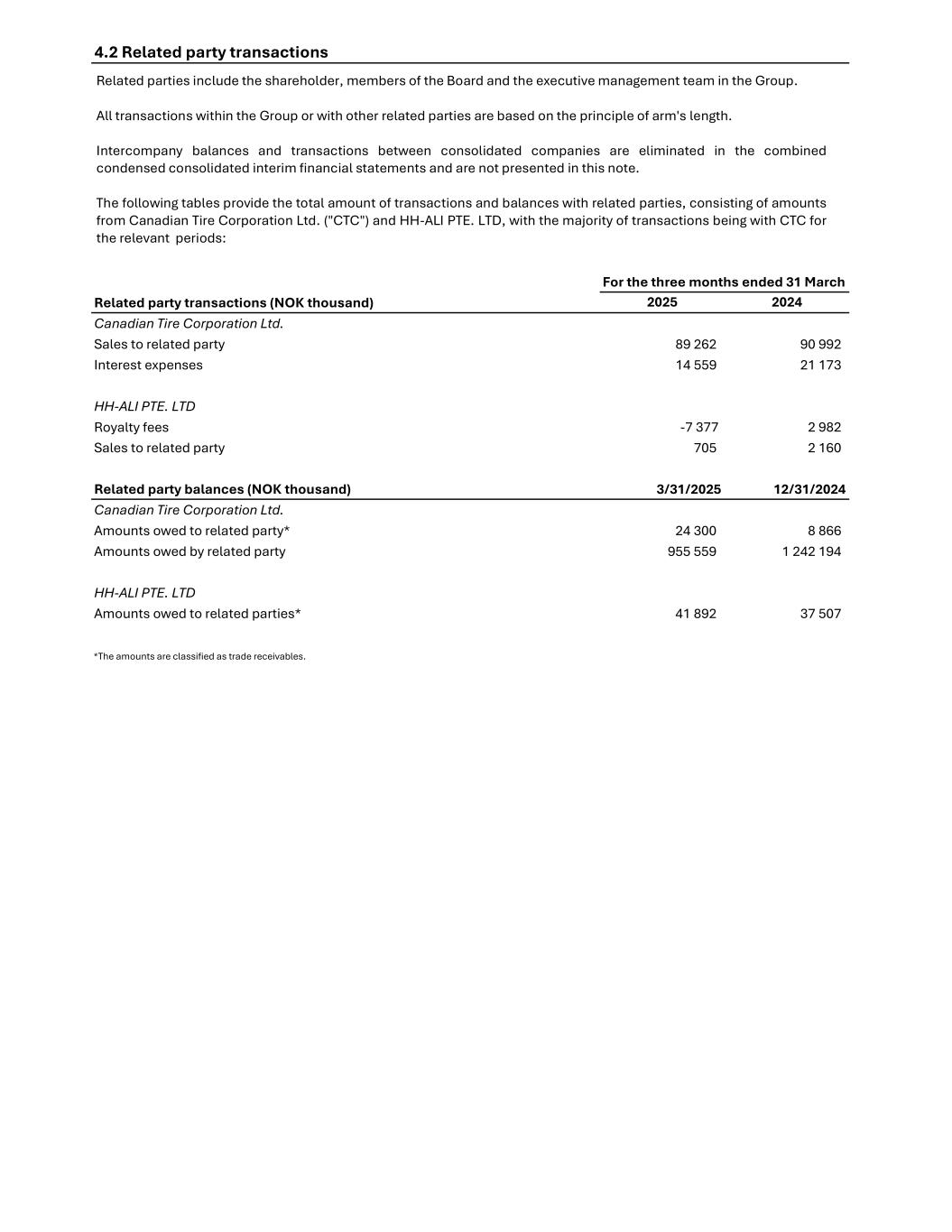 4.2 Related party transactions For the three months ended 31 March Related party transactions (NOK thousand) 2025 2024 Canadian Tire Corporation Ltd. Sales to related party 89 262 90 992 Interest expenses 14 559 21 173 HH-ALI PTE. LTD Royalty fees -7 377 2 982 Sales to related party 705 2 160 Related party balances (NOK thousand) 3/31/2025 12/31/2024 Canadian Tire Corporation Ltd. Amounts owed to related party* 24 300 8 866 Amounts owed by related party 955 559 1 242 194 HH-ALI PTE. LTD Amounts owed to related parties* 41 892 37 507 *The amounts are classified as trade receivables. Related parties include the shareholder, members of the Board and the executive management team in the Group. All transactions within the Group or with other related parties are based on the principle of arm's length. Intercompany balances and transactions between consolidated companies are eliminated in the combined condensed consolidated interim financial statements and are not presented in this note. The following tables provide the total amount of transactions and balances with related parties, consisting of amounts from Canadian Tire Corporation Ltd. ("CTC") and HH-ALI PTE. LTD, with the majority of transactions being with CTC for the relevant periods:
