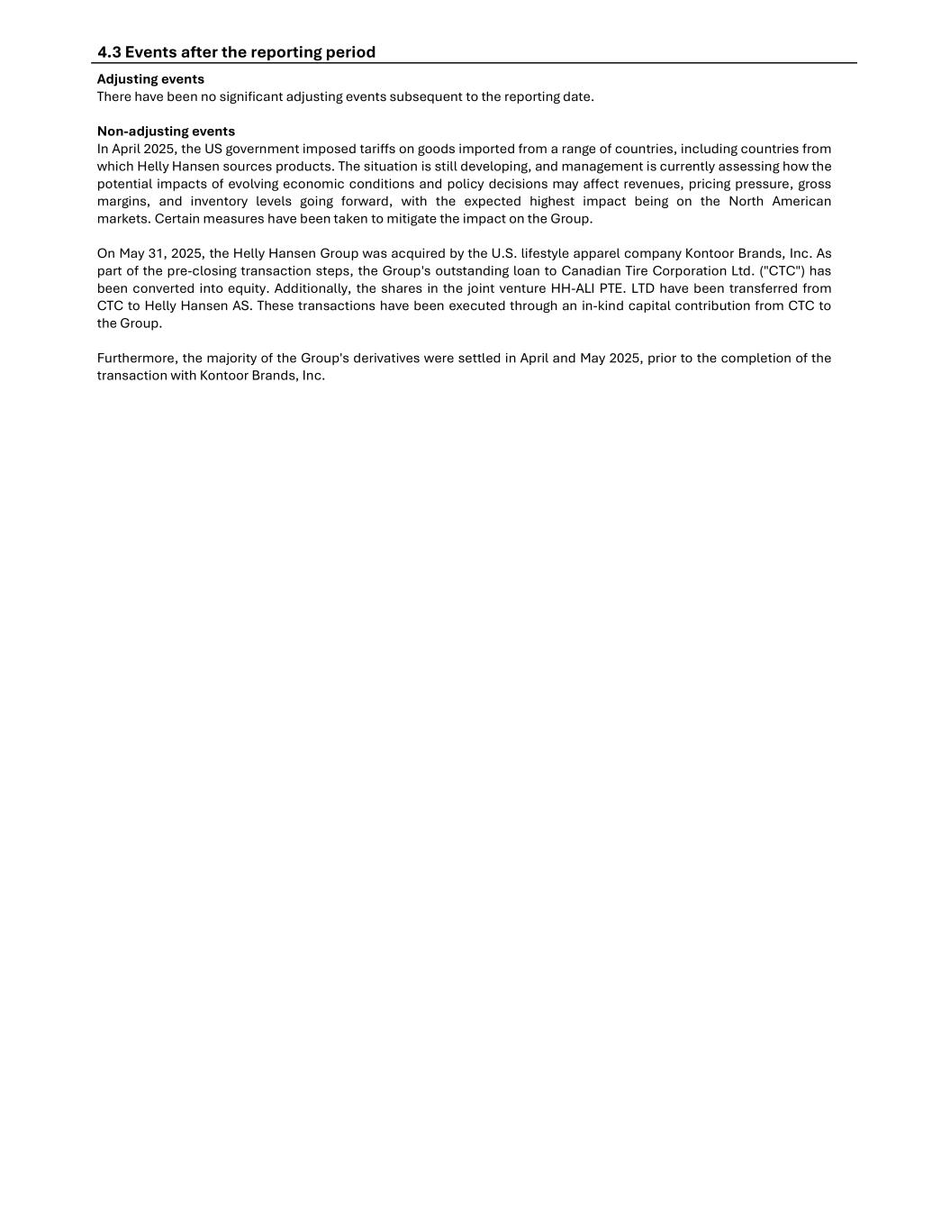 4.3 Events after the reporting period Adjusting events There have been no significant adjusting events subsequent to the reporting date. Non-adjusting events In April 2025, the US government imposed tariffs on goods imported from a range of countries, including countries from which Helly Hansen sources products. The situation is still developing, and management is currently assessing how the potential impacts of evolving economic conditions and policy decisions may affect revenues, pricing pressure, gross margins, and inventory levels going forward, with the expected highest impact being on the North American markets. Certain measures have been taken to mitigate the impact on the Group. On May 31, 2025, the Helly Hansen Group was acquired by the U.S. lifestyle apparel company Kontoor Brands, Inc. As part of the pre-closing transaction steps, the Group's outstanding loan to Canadian Tire Corporation Ltd. ("CTC") has been converted into equity. Additionally, the shares in the joint venture HH-ALI PTE. LTD have been transferred from CTC to Helly Hansen AS. These transactions have been executed through an in-kind capital contribution from CTC to the Group. Furthermore, the majority of the Group's derivatives were settled in April and May 2025, prior to the completion of the transaction with Kontoor Brands, Inc.
