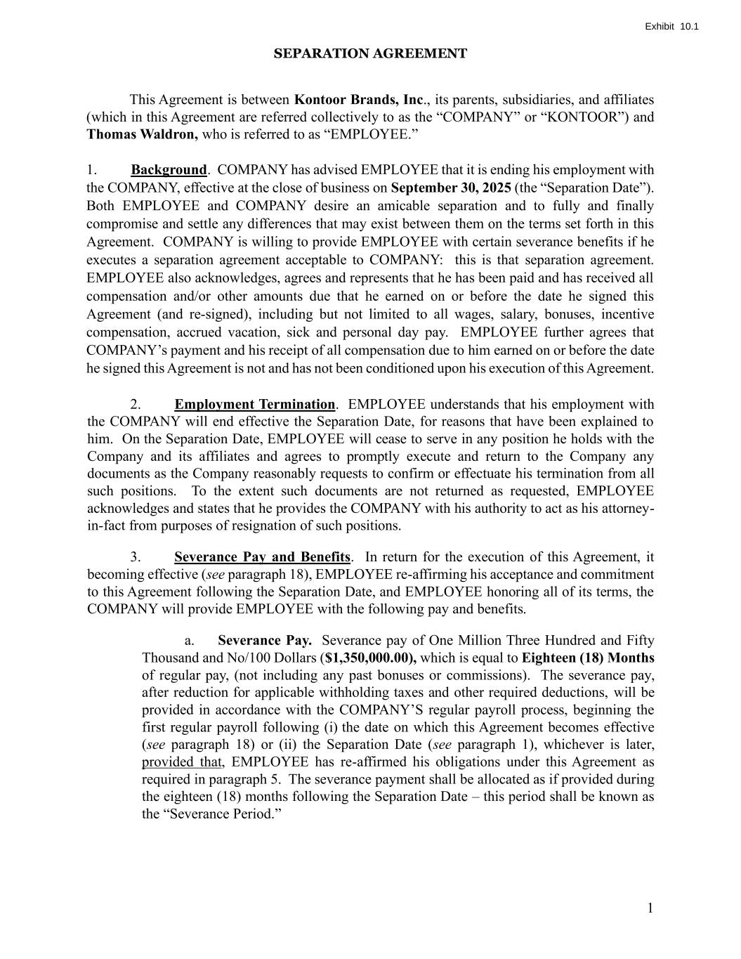 1 SEPARATION AGREEMENT This Agreement is between Kontoor Brands, Inc., its parents, subsidiaries, and affiliates (which in this Agreement are referred collectively to as the “COMPANY” or “KONTOOR”) and Thomas Waldron, who is referred to as “EMPLOYEE.” 1. Background. COMPANY has advised EMPLOYEE that it is ending his employment with the COMPANY, effective at the close of business on September 30, 2025 (the “Separation Date”). Both EMPLOYEE and COMPANY desire an amicable separation and to fully and finally compromise and settle any differences that may exist between them on the terms set forth in this Agreement. COMPANY is willing to provide EMPLOYEE with certain severance benefits if he executes a separation agreement acceptable to COMPANY: this is that separation agreement. EMPLOYEE also acknowledges, agrees and represents that he has been paid and has received all compensation and/or other amounts due that he earned on or before the date he signed this Agreement (and re-signed), including but not limited to all wages, salary, bonuses, incentive compensation, accrued vacation, sick and personal day pay. EMPLOYEE further agrees that COMPANY’s payment and his receipt of all compensation due to him earned on or before the date he signed this Agreement is not and has not been conditioned upon his execution of this Agreement. 2. Employment Termination. EMPLOYEE understands that his employment with the COMPANY will end effective the Separation Date, for reasons that have been explained to him. On the Separation Date, EMPLOYEE will cease to serve in any position he holds with the Company and its affiliates and agrees to promptly execute and return to the Company any documents as the Company reasonably requests to confirm or effectuate his termination from all such positions. To the extent such documents are not returned as requested, EMPLOYEE acknowledges and states that he provides the COMPANY with his authority to act as his attorney- in-fact from purposes of resignation of such positions. 3. Severance Pay and Benefits. In return for the execution of this Agreement, it becoming effective (see paragraph 18), EMPLOYEE re-affirming his acceptance and commitment to this Agreement following the Separation Date, and EMPLOYEE honoring all of its terms, the COMPANY will provide EMPLOYEE with the following pay and benefits. a. Severance Pay. Severance pay of One Million Three Hundred and Fifty Thousand and No/100 Dollars ($1,350,000.00), which is equal to Eighteen (18) Months of regular pay, (not including any past bonuses or commissions). The severance pay, after reduction for applicable withholding taxes and other required deductions, will be provided in accordance with the COMPANY’S regular payroll process, beginning the first regular payroll following (i) the date on which this Agreement becomes effective (see paragraph 18) or (ii) the Separation Date (see paragraph 1), whichever is later, provided that, EMPLOYEE has re-affirmed his obligations under this Agreement as required in paragraph 5. The severance payment shall be allocated as if provided during the eighteen (18) months following the Separation Date – this period shall be known as the “Severance Period.”