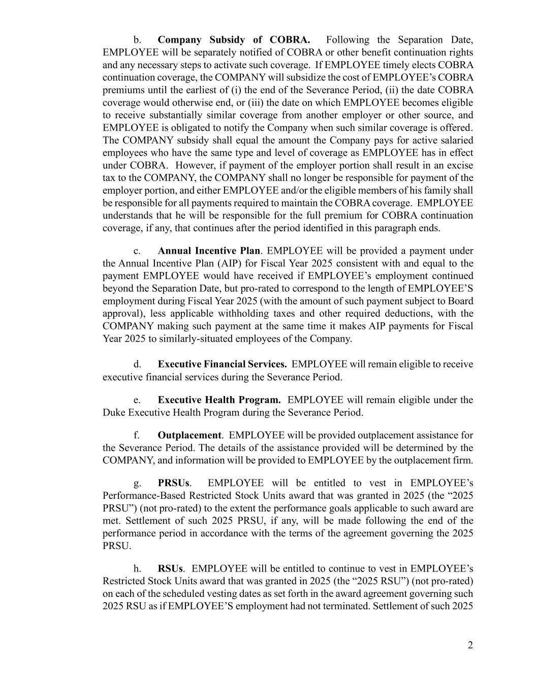 2 b. Company Subsidy of COBRA. Following the Separation Date, EMPLOYEE will be separately notified of COBRA or other benefit continuation rights and any necessary steps to activate such coverage. If EMPLOYEE timely elects COBRA continuation coverage, the COMPANY will subsidize the cost of EMPLOYEE’s COBRA premiums until the earliest of (i) the end of the Severance Period, (ii) the date COBRA coverage would otherwise end, or (iii) the date on which EMPLOYEE becomes eligible to receive substantially similar coverage from another employer or other source, and EMPLOYEE is obligated to notify the Company when such similar coverage is offered. The COMPANY subsidy shall equal the amount the Company pays for active salaried employees who have the same type and level of coverage as EMPLOYEE has in effect under COBRA. However, if payment of the employer portion shall result in an excise tax to the COMPANY, the COMPANY shall no longer be responsible for payment of the employer portion, and either EMPLOYEE and/or the eligible members of his family shall be responsible for all payments required to maintain the COBRA coverage. EMPLOYEE understands that he will be responsible for the full premium for COBRA continuation coverage, if any, that continues after the period identified in this paragraph ends. c. Annual Incentive Plan. EMPLOYEE will be provided a payment under the Annual Incentive Plan (AIP) for Fiscal Year 2025 consistent with and equal to the payment EMPLOYEE would have received if EMPLOYEE’s employment continued beyond the Separation Date, but pro-rated to correspond to the length of EMPLOYEE’S employment during Fiscal Year 2025 (with the amount of such payment subject to Board approval), less applicable withholding taxes and other required deductions, with the COMPANY making such payment at the same time it makes AIP payments for Fiscal Year 2025 to similarly-situated employees of the Company. d. Executive Financial Services. EMPLOYEE will remain eligible to receive executive financial services during the Severance Period. e. Executive Health Program. EMPLOYEE will remain eligible under the Duke Executive Health Program during the Severance Period. f. Outplacement. EMPLOYEE will be provided outplacement assistance for the Severance Period. The details of the assistance provided will be determined by the COMPANY, and information will be provided to EMPLOYEE by the outplacement firm. g. PRSUs. EMPLOYEE will be entitled to vest in EMPLOYEE’s Performance-Based Restricted Stock Units award that was granted in 2025 (the “2025 PRSU”) (not pro-rated) to the extent the performance goals applicable to such award are met. Settlement of such 2025 PRSU, if any, will be made following the end of the performance period in accordance with the terms of the agreement governing the 2025 PRSU. h. RSUs. EMPLOYEE will be entitled to continue to vest in EMPLOYEE’s Restricted Stock Units award that was granted in 2025 (the “2025 RSU”) (not pro-rated) on each of the scheduled vesting dates as set forth in the award agreement governing such 2025 RSU as if EMPLOYEE’S employment had not terminated. Settlement of such 2025