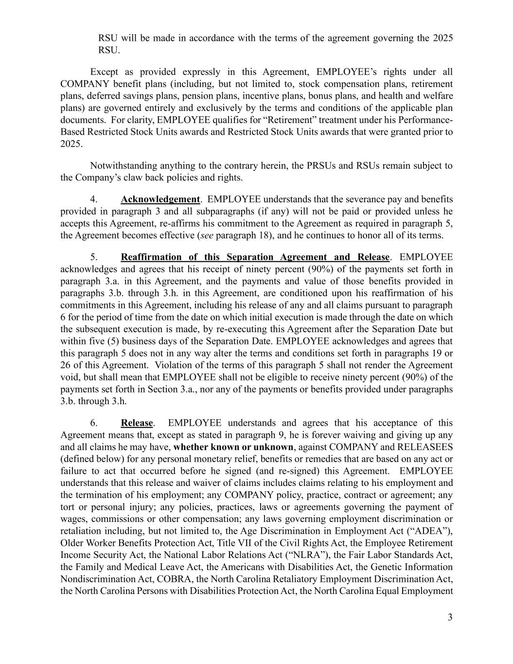 3 RSU will be made in accordance with the terms of the agreement governing the 2025 RSU. Except as provided expressly in this Agreement, EMPLOYEE’s rights under all COMPANY benefit plans (including, but not limited to, stock compensation plans, retirement plans, deferred savings plans, pension plans, incentive plans, bonus plans, and health and welfare plans) are governed entirely and exclusively by the terms and conditions of the applicable plan documents. For clarity, EMPLOYEE qualifies for “Retirement” treatment under his Performance- Based Restricted Stock Units awards and Restricted Stock Units awards that were granted prior to 2025. Notwithstanding anything to the contrary herein, the PRSUs and RSUs remain subject to the Company’s claw back policies and rights. 4. Acknowledgement. EMPLOYEE understands that the severance pay and benefits provided in paragraph 3 and all subparagraphs (if any) will not be paid or provided unless he accepts this Agreement, re-affirms his commitment to the Agreement as required in paragraph 5, the Agreement becomes effective (see paragraph 18), and he continues to honor all of its terms. 5. Reaffirmation of this Separation Agreement and Release. EMPLOYEE acknowledges and agrees that his receipt of ninety percent (90%) of the payments set forth in paragraph 3.a. in this Agreement, and the payments and value of those benefits provided in paragraphs 3.b. through 3.h. in this Agreement, are conditioned upon his reaffirmation of his commitments in this Agreement, including his release of any and all claims pursuant to paragraph 6 for the period of time from the date on which initial execution is made through the date on which the subsequent execution is made, by re-executing this Agreement after the Separation Date but within five (5) business days of the Separation Date. EMPLOYEE acknowledges and agrees that this paragraph 5 does not in any way alter the terms and conditions set forth in paragraphs 19 or 26 of this Agreement. Violation of the terms of this paragraph 5 shall not render the Agreement void, but shall mean that EMPLOYEE shall not be eligible to receive ninety percent (90%) of the payments set forth in Section 3.a., nor any of the payments or benefits provided under paragraphs 3.b. through 3.h. 6. Release. EMPLOYEE understands and agrees that his acceptance of this Agreement means that, except as stated in paragraph 9, he is forever waiving and giving up any and all claims he may have, whether known or unknown, against COMPANY and RELEASEES (defined below) for any personal monetary relief, benefits or remedies that are based on any act or failure to act that occurred before he signed (and re-signed) this Agreement. EMPLOYEE understands that this release and waiver of claims includes claims relating to his employment and the termination of his employment; any COMPANY policy, practice, contract or agreement; any tort or personal injury; any policies, practices, laws or agreements governing the payment of wages, commissions or other compensation; any laws governing employment discrimination or retaliation including, but not limited to, the Age Discrimination in Employment Act (“ADEA”), Older Worker Benefits Protection Act, Title VII of the Civil Rights Act, the Employee Retirement Income Security Act, the National Labor Relations Act (“NLRA”), the Fair Labor Standards Act, the Family and Medical Leave Act, the Americans with Disabilities Act, the Genetic Information Nondiscrimination Act, COBRA, the North Carolina Retaliatory Employment Discrimination Act, the North Carolina Persons with Disabilities Protection Act, the North Carolina Equal Employment