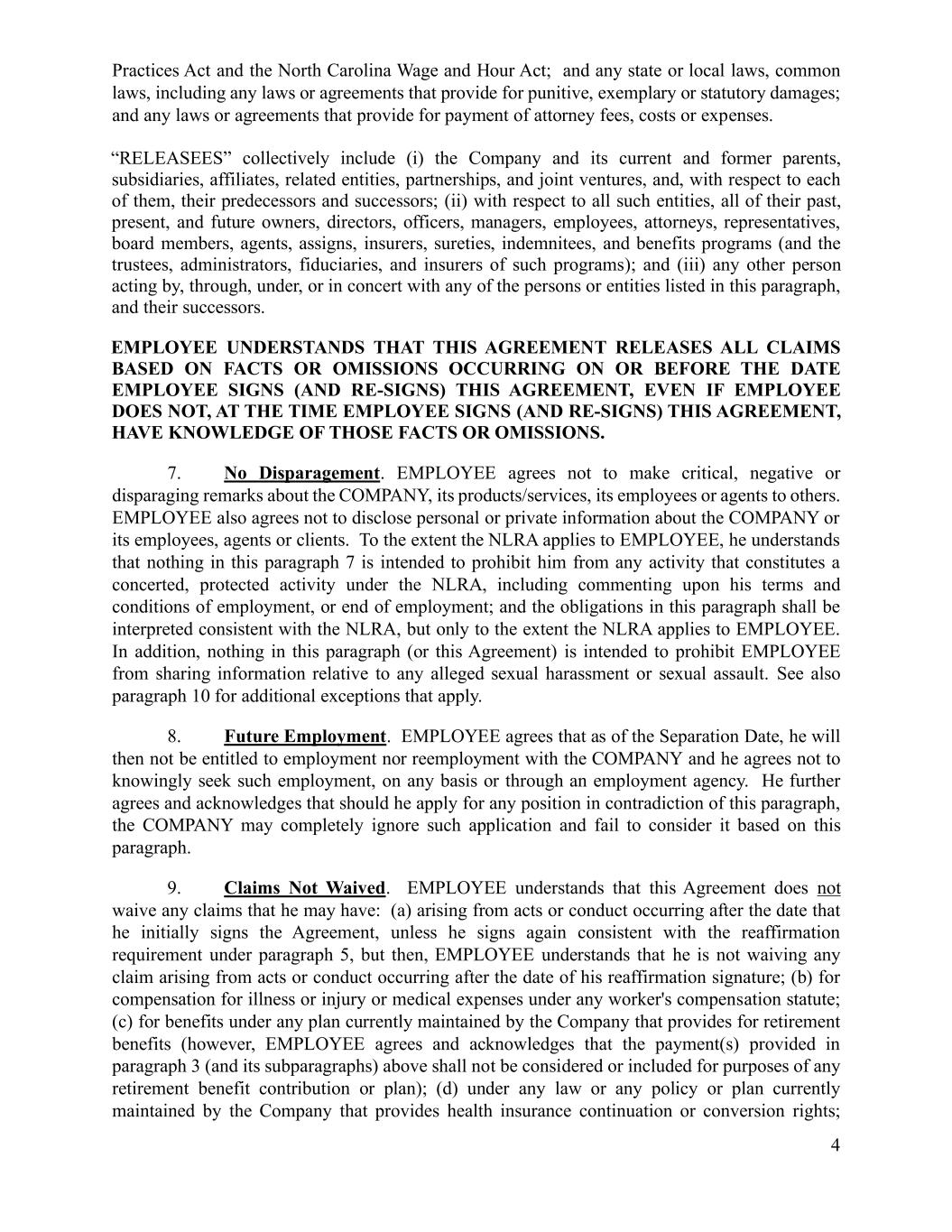4 Practices Act and the North Carolina Wage and Hour Act; and any state or local laws, common laws, including any laws or agreements that provide for punitive, exemplary or statutory damages; and any laws or agreements that provide for payment of attorney fees, costs or expenses. “RELEASEES” collectively include (i) the Company and its current and former parents, subsidiaries, affiliates, related entities, partnerships, and joint ventures, and, with respect to each of them, their predecessors and successors; (ii) with respect to all such entities, all of their past, present, and future owners, directors, officers, managers, employees, attorneys, representatives, board members, agents, assigns, insurers, sureties, indemnitees, and benefits programs (and the trustees, administrators, fiduciaries, and insurers of such programs); and (iii) any other person acting by, through, under, or in concert with any of the persons or entities listed in this paragraph, and their successors. EMPLOYEE UNDERSTANDS THAT THIS AGREEMENT RELEASES ALL CLAIMS BASED ON FACTS OR OMISSIONS OCCURRING ON OR BEFORE THE DATE EMPLOYEE SIGNS (AND RE-SIGNS) THIS AGREEMENT, EVEN IF EMPLOYEE DOES NOT, AT THE TIME EMPLOYEE SIGNS (AND RE-SIGNS) THIS AGREEMENT, HAVE KNOWLEDGE OF THOSE FACTS OR OMISSIONS. 7. No Disparagement. EMPLOYEE agrees not to make critical, negative or disparaging remarks about the COMPANY, its products/services, its employees or agents to others. EMPLOYEE also agrees not to disclose personal or private information about the COMPANY or its employees, agents or clients. To the extent the NLRA applies to EMPLOYEE, he understands that nothing in this paragraph 7 is intended to prohibit him from any activity that constitutes a concerted, protected activity under the NLRA, including commenting upon his terms and conditions of employment, or end of employment; and the obligations in this paragraph shall be interpreted consistent with the NLRA, but only to the extent the NLRA applies to EMPLOYEE. In addition, nothing in this paragraph (or this Agreement) is intended to prohibit EMPLOYEE from sharing information relative to any alleged sexual harassment or sexual assault. See also paragraph 10 for additional exceptions that apply. 8. Future Employment. EMPLOYEE agrees that as of the Separation Date, he will then not be entitled to employment nor reemployment with the COMPANY and he agrees not to knowingly seek such employment, on any basis or through an employment agency. He further agrees and acknowledges that should he apply for any position in contradiction of this paragraph, the COMPANY may completely ignore such application and fail to consider it based on this paragraph. 9. Claims Not Waived. EMPLOYEE understands that this Agreement does not waive any claims that he may have: (a) arising from acts or conduct occurring after the date that he initially signs the Agreement, unless he signs again consistent with the reaffirmation requirement under paragraph 5, but then, EMPLOYEE understands that he is not waiving any claim arising from acts or conduct occurring after the date of his reaffirmation signature; (b) for compensation for illness or injury or medical expenses under any worker's compensation statute; (c) for benefits under any plan currently maintained by the Company that provides for retirement benefits (however, EMPLOYEE agrees and acknowledges that the payment(s) provided in paragraph 3 (and its subparagraphs) above shall not be considered or included for purposes of any retirement benefit contribution or plan); (d) under any law or any policy or plan currently maintained by the Company that provides health insurance continuation or conversion rights;
