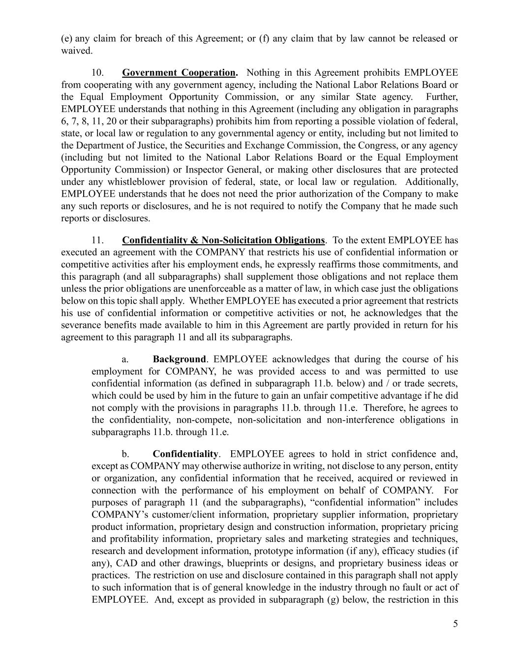 5 (e) any claim for breach of this Agreement; or (f) any claim that by law cannot be released or waived. 10. Government Cooperation. Nothing in this Agreement prohibits EMPLOYEE from cooperating with any government agency, including the National Labor Relations Board or the Equal Employment Opportunity Commission, or any similar State agency. Further, EMPLOYEE understands that nothing in this Agreement (including any obligation in paragraphs 6, 7, 8, 11, 20 or their subparagraphs) prohibits him from reporting a possible violation of federal, state, or local law or regulation to any governmental agency or entity, including but not limited to the Department of Justice, the Securities and Exchange Commission, the Congress, or any agency (including but not limited to the National Labor Relations Board or the Equal Employment Opportunity Commission) or Inspector General, or making other disclosures that are protected under any whistleblower provision of federal, state, or local law or regulation. Additionally, EMPLOYEE understands that he does not need the prior authorization of the Company to make any such reports or disclosures, and he is not required to notify the Company that he made such reports or disclosures. 11. Confidentiality & Non-Solicitation Obligations. To the extent EMPLOYEE has executed an agreement with the COMPANY that restricts his use of confidential information or competitive activities after his employment ends, he expressly reaffirms those commitments, and this paragraph (and all subparagraphs) shall supplement those obligations and not replace them unless the prior obligations are unenforceable as a matter of law, in which case just the obligations below on this topic shall apply. Whether EMPLOYEE has executed a prior agreement that restricts his use of confidential information or competitive activities or not, he acknowledges that the severance benefits made available to him in this Agreement are partly provided in return for his agreement to this paragraph 11 and all its subparagraphs. a. Background. EMPLOYEE acknowledges that during the course of his employment for COMPANY, he was provided access to and was permitted to use confidential information (as defined in subparagraph 11.b. below) and / or trade secrets, which could be used by him in the future to gain an unfair competitive advantage if he did not comply with the provisions in paragraphs 11.b. through 11.e. Therefore, he agrees to the confidentiality, non-compete, non-solicitation and non-interference obligations in subparagraphs 11.b. through 11.e. b. Confidentiality. EMPLOYEE agrees to hold in strict confidence and, except as COMPANY may otherwise authorize in writing, not disclose to any person, entity or organization, any confidential information that he received, acquired or reviewed in connection with the performance of his employment on behalf of COMPANY. For purposes of paragraph 11 (and the subparagraphs), “confidential information” includes COMPANY’s customer/client information, proprietary supplier information, proprietary product information, proprietary design and construction information, proprietary pricing and profitability information, proprietary sales and marketing strategies and techniques, research and development information, prototype information (if any), efficacy studies (if any), CAD and other drawings, blueprints or designs, and proprietary business ideas or practices. The restriction on use and disclosure contained in this paragraph shall not apply to such information that is of general knowledge in the industry through no fault or act of EMPLOYEE. And, except as provided in subparagraph (g) below, the restriction in this
