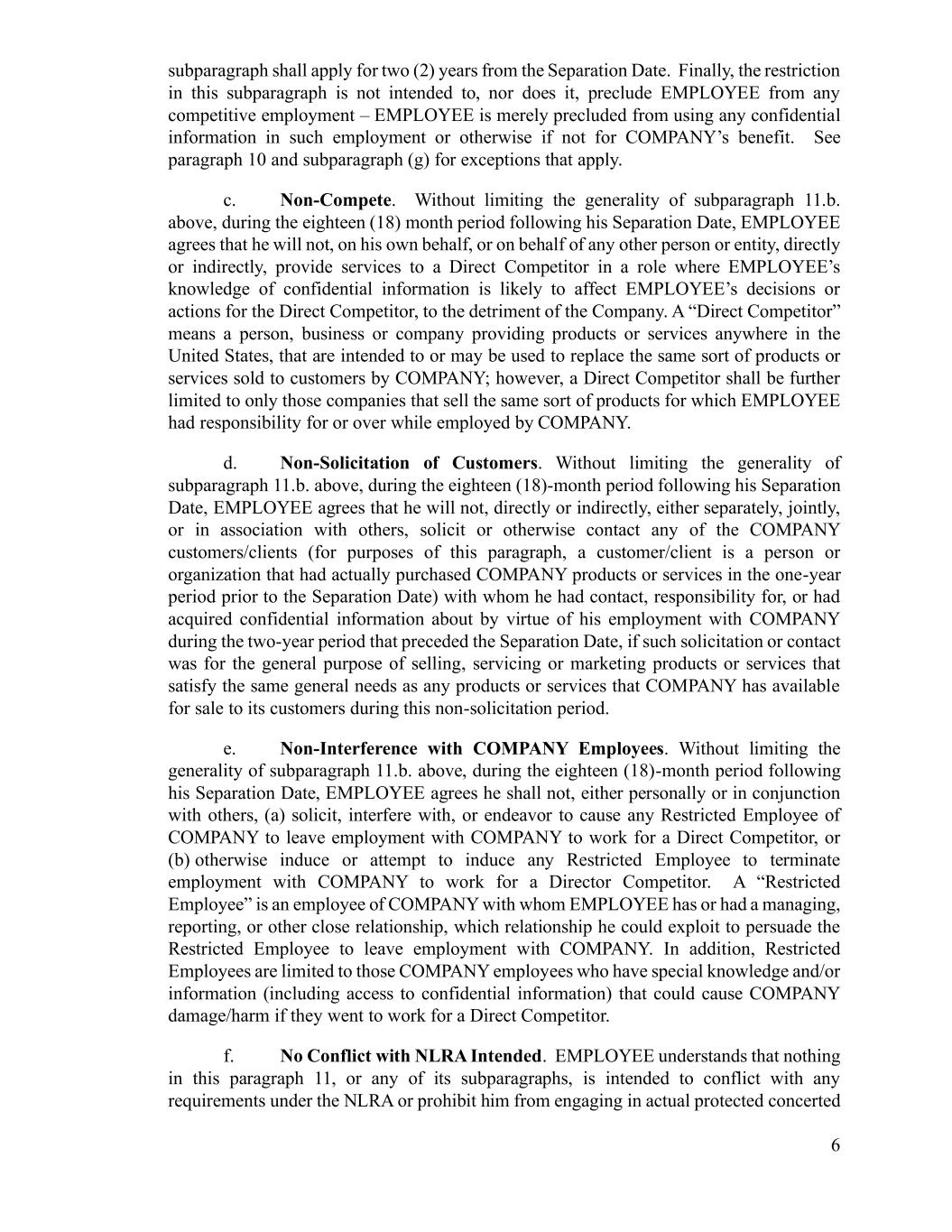 6 subparagraph shall apply for two (2) years from the Separation Date. Finally, the restriction in this subparagraph is not intended to, nor does it, preclude EMPLOYEE from any competitive employment – EMPLOYEE is merely precluded from using any confidential information in such employment or otherwise if not for COMPANY’s benefit. See paragraph 10 and subparagraph (g) for exceptions that apply. c. Non-Compete. Without limiting the generality of subparagraph 11.b. above, during the eighteen (18) month period following his Separation Date, EMPLOYEE agrees that he will not, on his own behalf, or on behalf of any other person or entity, directly or indirectly, provide services to a Direct Competitor in a role where EMPLOYEE’s knowledge of confidential information is likely to affect EMPLOYEE’s decisions or actions for the Direct Competitor, to the detriment of the Company. A “Direct Competitor” means a person, business or company providing products or services anywhere in the United States, that are intended to or may be used to replace the same sort of products or services sold to customers by COMPANY; however, a Direct Competitor shall be further limited to only those companies that sell the same sort of products for which EMPLOYEE had responsibility for or over while employed by COMPANY. d. Non-Solicitation of Customers. Without limiting the generality of subparagraph 11.b. above, during the eighteen (18)-month period following his Separation Date, EMPLOYEE agrees that he will not, directly or indirectly, either separately, jointly, or in association with others, solicit or otherwise contact any of the COMPANY customers/clients (for purposes of this paragraph, a customer/client is a person or organization that had actually purchased COMPANY products or services in the one-year period prior to the Separation Date) with whom he had contact, responsibility for, or had acquired confidential information about by virtue of his employment with COMPANY during the two-year period that preceded the Separation Date, if such solicitation or contact was for the general purpose of selling, servicing or marketing products or services that satisfy the same general needs as any products or services that COMPANY has available for sale to its customers during this non-solicitation period. e. Non-Interference with COMPANY Employees. Without limiting the generality of subparagraph 11.b. above, during the eighteen (18)-month period following his Separation Date, EMPLOYEE agrees he shall not, either personally or in conjunction with others, (a) solicit, interfere with, or endeavor to cause any Restricted Employee of COMPANY to leave employment with COMPANY to work for a Direct Competitor, or (b) otherwise induce or attempt to induce any Restricted Employee to terminate employment with COMPANY to work for a Director Competitor. A “Restricted Employee” is an employee of COMPANY with whom EMPLOYEE has or had a managing, reporting, or other close relationship, which relationship he could exploit to persuade the Restricted Employee to leave employment with COMPANY. In addition, Restricted Employees are limited to those COMPANY employees who have special knowledge and/or information (including access to confidential information) that could cause COMPANY damage/harm if they went to work for a Direct Competitor. f. No Conflict with NLRA Intended. EMPLOYEE understands that nothing in this paragraph 11, or any of its subparagraphs, is intended to conflict with any requirements under the NLRA or prohibit him from engaging in actual protected concerted