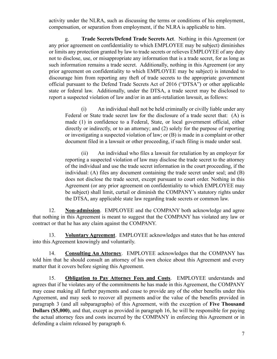 7 activity under the NLRA, such as discussing the terms or conditions of his employment, compensation, or separation from employment, if the NLRA is applicable to him. g. Trade Secrets/Defend Trade Secrets Act. Nothing in this Agreement (or any prior agreement on confidentiality to which EMPLOYEE may be subject) diminishes or limits any protection granted by law to trade secrets or relieves EMPLOYEE of any duty not to disclose, use, or misappropriate any information that is a trade secret, for as long as such information remains a trade secret. Additionally, nothing in this Agreement (or any prior agreement on confidentiality to which EMPLOYEE may be subject) is intended to discourage him from reporting any theft of trade secrets to the appropriate government official pursuant to the Defend Trade Secrets Act of 2016 (“DTSA”) or other applicable state or federal law. Additionally, under the DTSA, a trade secret may be disclosed to report a suspected violation of law and/or in an anti-retaliation lawsuit, as follows: (i) An individual shall not be held criminally or civilly liable under any Federal or State trade secret law for the disclosure of a trade secret that: (A) is made (1) in confidence to a Federal, State, or local government official, either directly or indirectly, or to an attorney; and (2) solely for the purpose of reporting or investigating a suspected violation of law; or (B) is made in a complaint or other document filed in a lawsuit or other proceeding, if such filing is made under seal. (ii) An individual who files a lawsuit for retaliation by an employer for reporting a suspected violation of law may disclose the trade secret to the attorney of the individual and use the trade secret information in the court proceeding, if the individual: (A) files any document containing the trade secret under seal; and (B) does not disclose the trade secret, except pursuant to court order. Nothing in this Agreement (or any prior agreement on confidentiality to which EMPLOYEE may be subject) shall limit, curtail or diminish the COMPANY’s statutory rights under the DTSA, any applicable state law regarding trade secrets or common law. 12. Non-admission. EMPLOYEE and the COMPANY both acknowledge and agree that nothing in this Agreement is meant to suggest that the COMPANY has violated any law or contract or that he has any claim against the COMPANY. 13. Voluntary Agreement. EMPLOYEE acknowledges and states that he has entered into this Agreement knowingly and voluntarily. 14. Consulting An Attorney. EMPLOYEE acknowledges that the COMPANY has told him that he should consult an attorney of his own choice about this Agreement and every matter that it covers before signing this Agreement. 15. Obligation to Pay Attorney Fees and Costs. EMPLOYEE understands and agrees that if he violates any of the commitments he has made in this Agreement, the COMPANY may cease making all further payments and cease to provide any of the other benefits under this Agreement, and may seek to recover all payments and/or the value of the benefits provided in paragraph 3 (and all subparagraphs) of this Agreement, with the exception of Five Thousand Dollars ($5,000), and that, except as provided in paragraph 16, he will be responsible for paying the actual attorney fees and costs incurred by the COMPANY in enforcing this Agreement or in defending a claim released by paragraph 6.