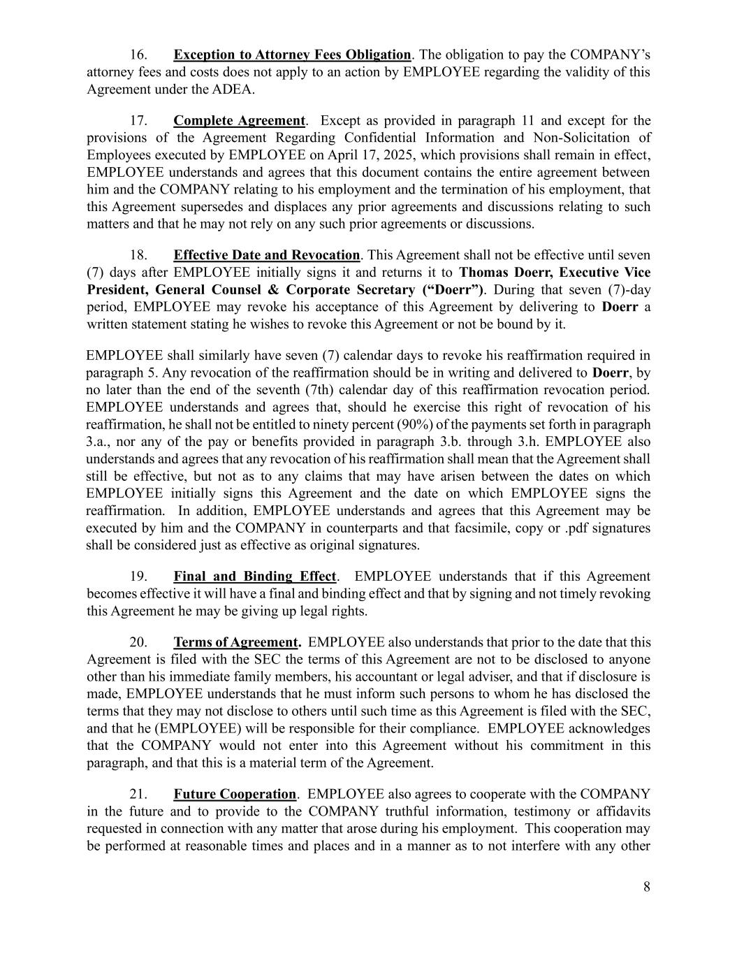 8 16. Exception to Attorney Fees Obligation. The obligation to pay the COMPANY’s attorney fees and costs does not apply to an action by EMPLOYEE regarding the validity of this Agreement under the ADEA. 17. Complete Agreement. Except as provided in paragraph 11 and except for the provisions of the Agreement Regarding Confidential Information and Non-Solicitation of Employees executed by EMPLOYEE on April 17, 2025, which provisions shall remain in effect, EMPLOYEE understands and agrees that this document contains the entire agreement between him and the COMPANY relating to his employment and the termination of his employment, that this Agreement supersedes and displaces any prior agreements and discussions relating to such matters and that he may not rely on any such prior agreements or discussions. 18. Effective Date and Revocation. This Agreement shall not be effective until seven (7) days after EMPLOYEE initially signs it and returns it to Thomas Doerr, Executive Vice President, General Counsel & Corporate Secretary (“Doerr”). During that seven (7)-day period, EMPLOYEE may revoke his acceptance of this Agreement by delivering to Doerr a written statement stating he wishes to revoke this Agreement or not be bound by it. EMPLOYEE shall similarly have seven (7) calendar days to revoke his reaffirmation required in paragraph 5. Any revocation of the reaffirmation should be in writing and delivered to Doerr, by no later than the end of the seventh (7th) calendar day of this reaffirmation revocation period. EMPLOYEE understands and agrees that, should he exercise this right of revocation of his reaffirmation, he shall not be entitled to ninety percent (90%) of the payments set forth in paragraph 3.a., nor any of the pay or benefits provided in paragraph 3.b. through 3.h. EMPLOYEE also understands and agrees that any revocation of his reaffirmation shall mean that the Agreement shall still be effective, but not as to any claims that may have arisen between the dates on which EMPLOYEE initially signs this Agreement and the date on which EMPLOYEE signs the reaffirmation. In addition, EMPLOYEE understands and agrees that this Agreement may be executed by him and the COMPANY in counterparts and that facsimile, copy or .pdf signatures shall be considered just as effective as original signatures. 19. Final and Binding Effect. EMPLOYEE understands that if this Agreement becomes effective it will have a final and binding effect and that by signing and not timely revoking this Agreement he may be giving up legal rights. 20. Terms of Agreement. EMPLOYEE also understands that prior to the date that this Agreement is filed with the SEC the terms of this Agreement are not to be disclosed to anyone other than his immediate family members, his accountant or legal adviser, and that if disclosure is made, EMPLOYEE understands that he must inform such persons to whom he has disclosed the terms that they may not disclose to others until such time as this Agreement is filed with the SEC, and that he (EMPLOYEE) will be responsible for their compliance. EMPLOYEE acknowledges that the COMPANY would not enter into this Agreement without his commitment in this paragraph, and that this is a material term of the Agreement. 21. Future Cooperation. EMPLOYEE also agrees to cooperate with the COMPANY in the future and to provide to the COMPANY truthful information, testimony or affidavits requested in connection with any matter that arose during his employment. This cooperation may be performed at reasonable times and places and in a manner as to not interfere with any other