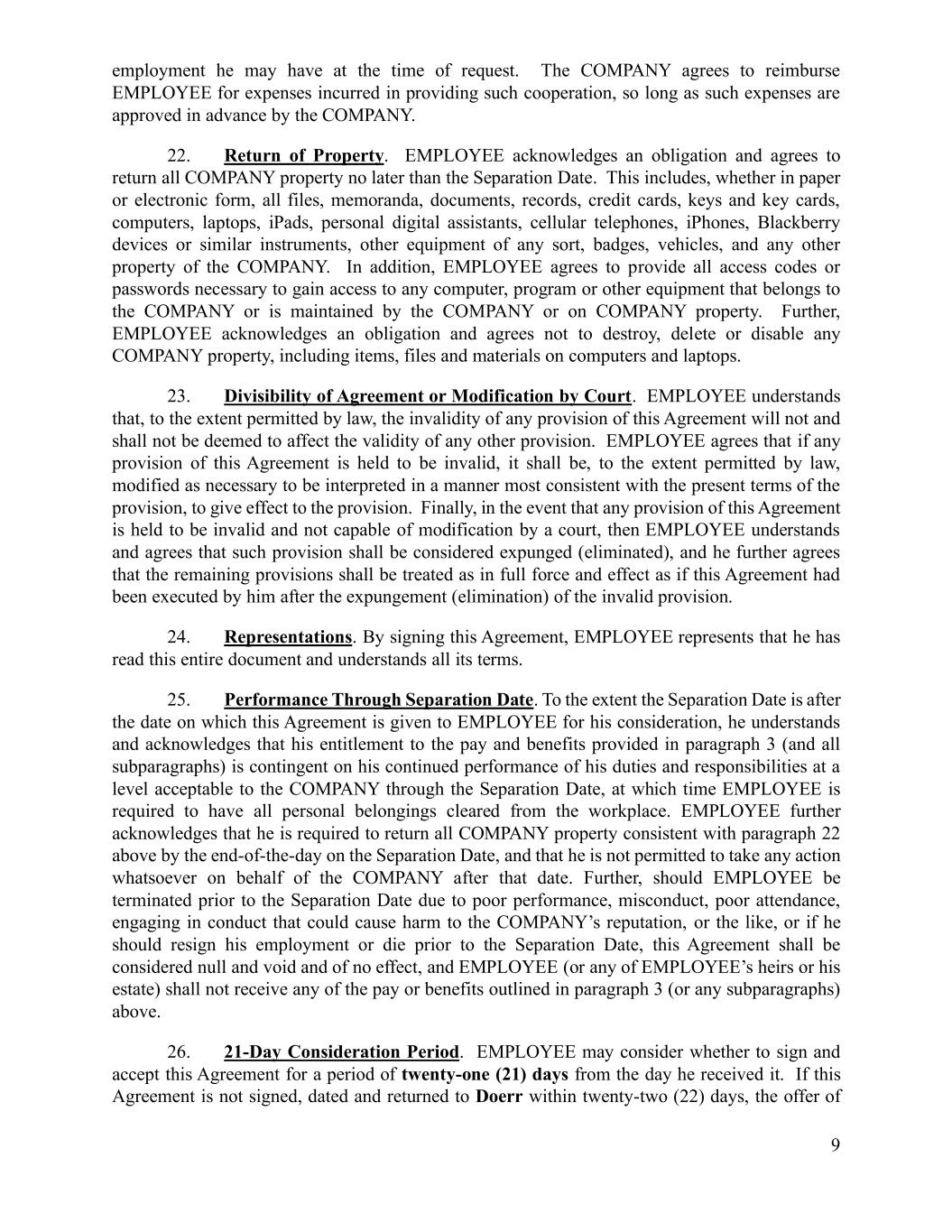 9 employment he may have at the time of request. The COMPANY agrees to reimburse EMPLOYEE for expenses incurred in providing such cooperation, so long as such expenses are approved in advance by the COMPANY. 22. Return of Property. EMPLOYEE acknowledges an obligation and agrees to return all COMPANY property no later than the Separation Date. This includes, whether in paper or electronic form, all files, memoranda, documents, records, credit cards, keys and key cards, computers, laptops, iPads, personal digital assistants, cellular telephones, iPhones, Blackberry devices or similar instruments, other equipment of any sort, badges, vehicles, and any other property of the COMPANY. In addition, EMPLOYEE agrees to provide all access codes or passwords necessary to gain access to any computer, program or other equipment that belongs to the COMPANY or is maintained by the COMPANY or on COMPANY property. Further, EMPLOYEE acknowledges an obligation and agrees not to destroy, delete or disable any COMPANY property, including items, files and materials on computers and laptops. 23. Divisibility of Agreement or Modification by Court. EMPLOYEE understands that, to the extent permitted by law, the invalidity of any provision of this Agreement will not and shall not be deemed to affect the validity of any other provision. EMPLOYEE agrees that if any provision of this Agreement is held to be invalid, it shall be, to the extent permitted by law, modified as necessary to be interpreted in a manner most consistent with the present terms of the provision, to give effect to the provision. Finally, in the event that any provision of this Agreement is held to be invalid and not capable of modification by a court, then EMPLOYEE understands and agrees that such provision shall be considered expunged (eliminated), and he further agrees that the remaining provisions shall be treated as in full force and effect as if this Agreement had been executed by him after the expungement (elimination) of the invalid provision. 24. Representations. By signing this Agreement, EMPLOYEE represents that he has read this entire document and understands all its terms. 25. Performance Through Separation Date. To the extent the Separation Date is after the date on which this Agreement is given to EMPLOYEE for his consideration, he understands and acknowledges that his entitlement to the pay and benefits provided in paragraph 3 (and all subparagraphs) is contingent on his continued performance of his duties and responsibilities at a level acceptable to the COMPANY through the Separation Date, at which time EMPLOYEE is required to have all personal belongings cleared from the workplace. EMPLOYEE further acknowledges that he is required to return all COMPANY property consistent with paragraph 22 above by the end-of-the-day on the Separation Date, and that he is not permitted to take any action whatsoever on behalf of the COMPANY after that date. Further, should EMPLOYEE be terminated prior to the Separation Date due to poor performance, misconduct, poor attendance, engaging in conduct that could cause harm to the COMPANY’s reputation, or the like, or if he should resign his employment or die prior to the Separation Date, this Agreement shall be considered null and void and of no effect, and EMPLOYEE (or any of EMPLOYEE’s heirs or his estate) shall not receive any of the pay or benefits outlined in paragraph 3 (or any subparagraphs) above. 26. 21-Day Consideration Period. EMPLOYEE may consider whether to sign and accept this Agreement for a period of twenty-one (21) days from the day he received it. If this Agreement is not signed, dated and returned to Doerr within twenty-two (22) days, the offer of