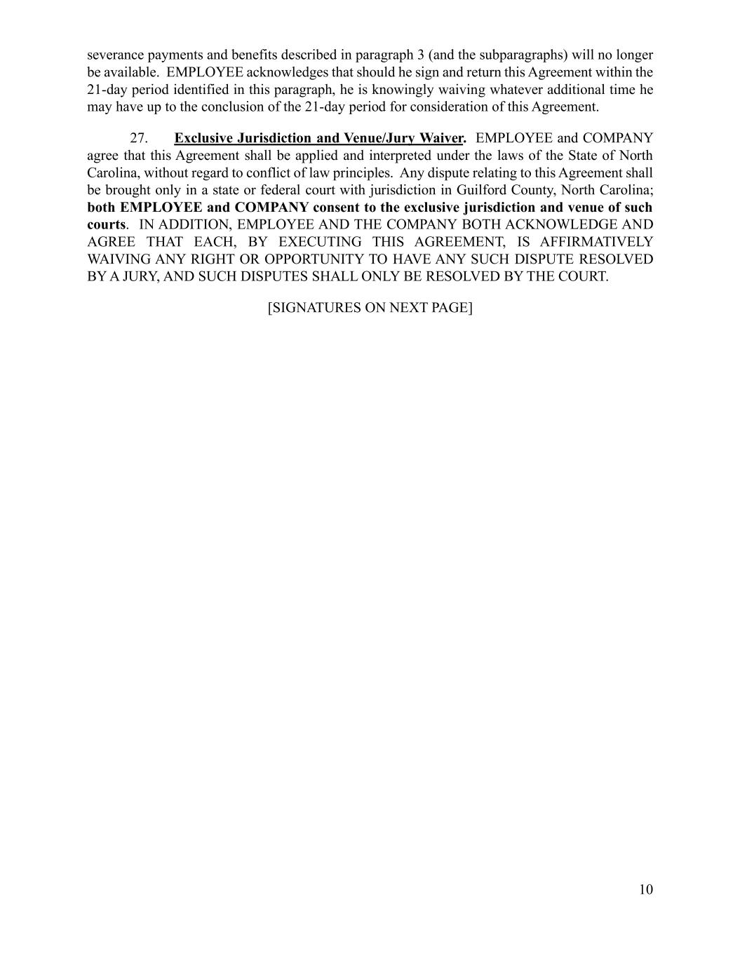 10 severance payments and benefits described in paragraph 3 (and the subparagraphs) will no longer be available. EMPLOYEE acknowledges that should he sign and return this Agreement within the 21-day period identified in this paragraph, he is knowingly waiving whatever additional time he may have up to the conclusion of the 21-day period for consideration of this Agreement. 27. Exclusive Jurisdiction and Venue/Jury Waiver. EMPLOYEE and COMPANY agree that this Agreement shall be applied and interpreted under the laws of the State of North Carolina, without regard to conflict of law principles. Any dispute relating to this Agreement shall be brought only in a state or federal court with jurisdiction in Guilford County, North Carolina; both EMPLOYEE and COMPANY consent to the exclusive jurisdiction and venue of such courts. IN ADDITION, EMPLOYEE AND THE COMPANY BOTH ACKNOWLEDGE AND AGREE THAT EACH, BY EXECUTING THIS AGREEMENT, IS AFFIRMATIVELY WAIVING ANY RIGHT OR OPPORTUNITY TO HAVE ANY SUCH DISPUTE RESOLVED BY A JURY, AND SUCH DISPUTES SHALL ONLY BE RESOLVED BY THE COURT. [SIGNATURES ON NEXT PAGE]