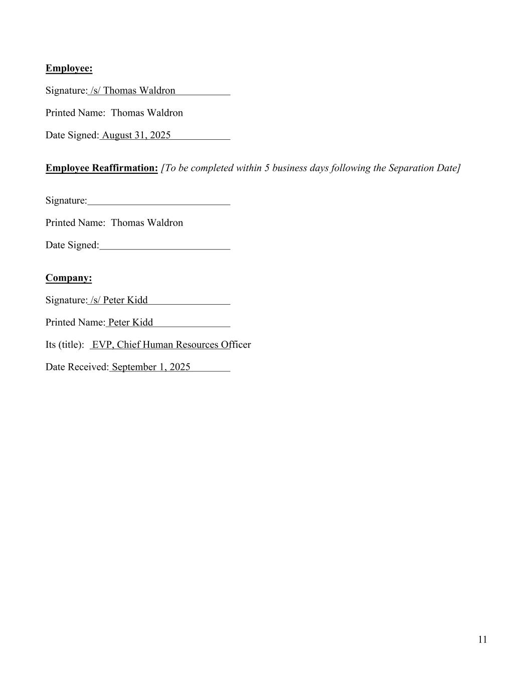 11 Employee: Signature: /s/ Thomas Waldron Printed Name: Thomas Waldron Date Signed: August 31, 2025 Employee Reaffirmation: [To be completed within 5 business days following the Separation Date] Signature: Printed Name: Thomas Waldron Date Signed: Company: Signature: /s/ Peter Kidd Printed Name: Peter Kidd Its (title): EVP, Chief Human Resources Officer Date Received: September 1, 2025