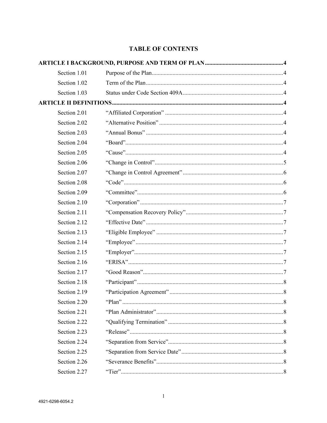 1 4921-6298-6054.2 TABLE OF CONTENTS BACKGROUND, PURPOSE AND TERM OF PLAN ..................................................... 4 Purpose of the Plan ......................................................................................... 4 Term of the Plan ............................................................................................. 4 Status under Code Section 409A .................................................................... 4 DEFINITIONS .................................................................................................................... 4 “Affiliated Corporation” ................................................................................ 4 “Alternative Position” .................................................................................... 4 “Annual Bonus” ............................................................................................. 4 “Board”........................................................................................................... 4 “Cause”........................................................................................................... 4 “Change in Control” ....................................................................................... 5 “Change in Control Agreement” .................................................................... 6 “Code” ............................................................................................................ 6 “Committee”................................................................................................... 6 “Corporation” ................................................................................................. 7 “Compensation Recovery Policy” .................................................................. 7 “Effective Date” ............................................................................................. 7 “Eligible Employee” ...................................................................................... 7 “Employee” .................................................................................................... 7 “Employer”..................................................................................................... 7 “ERISA” ......................................................................................................... 7 “Good Reason” ............................................................................................... 7 “Participant” ................................................................................................... 8 “Participation Agreement” ............................................................................. 8 “Plan” ............................................................................................................. 8 “Plan Administrator” ...................................................................................... 8 “Qualifying Termination” .............................................................................. 8 “Release” ........................................................................................................ 8 “Separation from Service”.............................................................................. 8 “Separation from Service Date” ..................................................................... 8 “Severance Benefits” ...................................................................................... 8 “Tier” .............................................................................................................. 8