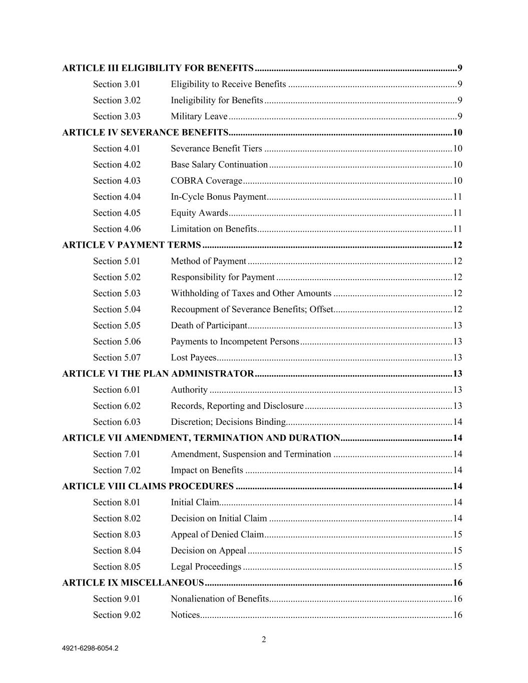 2 4921-6298-6054.2 ELIGIBILITY FOR BENEFITS ..................................................................................... 9 Eligibility to Receive Benefits ....................................................................... 9 Ineligibility for Benefits ................................................................................. 9 Military Leave ................................................................................................ 9 SEVERANCE BENEFITS.............................................................................................. 10 Severance Benefit Tiers ............................................................................... 10 Base Salary Continuation ............................................................................. 10 COBRA Coverage ........................................................................................ 10 In-Cycle Bonus Payment .............................................................................. 11 Equity Awards .............................................................................................. 11 Limitation on Benefits .................................................................................. 11 PAYMENT TERMS ......................................................................................................... 12 Method of Payment ...................................................................................... 12 Responsibility for Payment .......................................................................... 12 Withholding of Taxes and Other Amounts .................................................. 12 Recoupment of Severance Benefits; Offset. ................................................. 12 Death of Participant ...................................................................................... 13 Payments to Incompetent Persons ................................................................ 13 Lost Payees ................................................................................................... 13 THE PLAN ADMINISTRATOR ................................................................................... 13 Authority ...................................................................................................... 13 Records, Reporting and Disclosure .............................................................. 13 Discretion; Decisions Binding...................................................................... 14 AMENDMENT, TERMINATION AND DURATION............................................... 14 Amendment, Suspension and Termination .................................................. 14 Impact on Benefits ....................................................................................... 14 CLAIMS PROCEDURES ........................................................................................... 14 Initial Claim.................................................................................................. 14 Decision on Initial Claim ............................................................................. 14 Appeal of Denied Claim ............................................................................... 15 Decision on Appeal ...................................................................................... 15 Legal Proceedings ........................................................................................ 15 MISCELLANEOUS ........................................................................................................ 16 Nonalienation of Benefits ............................................................................. 16 Notices .......................................................................................................... 16