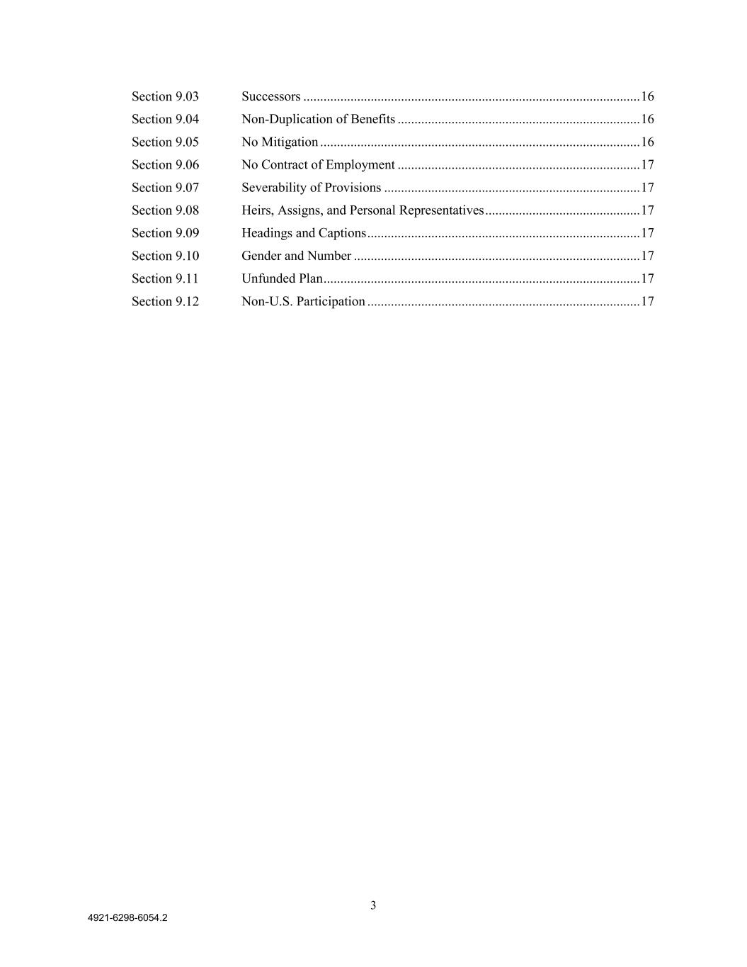 3 4921-6298-6054.2 Successors .................................................................................................... 16 Non-Duplication of Benefits ........................................................................ 16 No Mitigation ............................................................................................... 16 No Contract of Employment ........................................................................ 17 Severability of Provisions ............................................................................ 17 Heirs, Assigns, and Personal Representatives .............................................. 17 Headings and Captions ................................................................................. 17 Gender and Number ..................................................................................... 17 Unfunded Plan .............................................................................................. 17 Non-U.S. Participation ................................................................................. 17