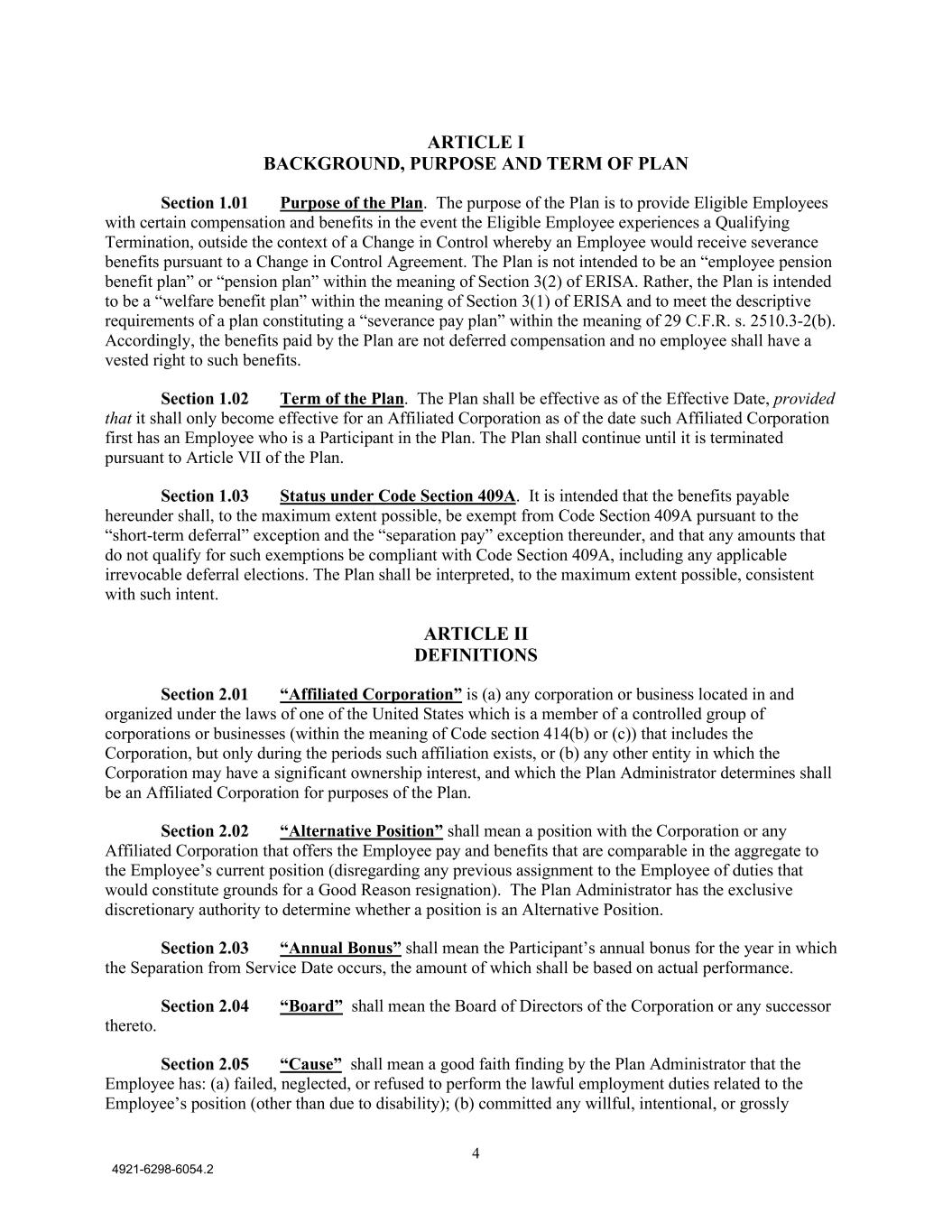 4 4921-6298-6054.2 BACKGROUND, PURPOSE AND TERM OF PLAN Purpose of the Plan. The purpose of the Plan is to provide Eligible Employees with certain compensation and benefits in the event the Eligible Employee experiences a Qualifying Termination, outside the context of a Change in Control whereby an Employee would receive severance benefits pursuant to a Change in Control Agreement. The Plan is not intended to be an “employee pension benefit plan” or “pension plan” within the meaning of Section 3(2) of ERISA. Rather, the Plan is intended to be a “welfare benefit plan” within the meaning of Section 3(1) of ERISA and to meet the descriptive requirements of a plan constituting a “severance pay plan” within the meaning of 29 C.F.R. s. 2510.3-2(b). Accordingly, the benefits paid by the Plan are not deferred compensation and no employee shall have a vested right to such benefits. Term of the Plan. The Plan shall be effective as of the Effective Date, provided that it shall only become effective for an Affiliated Corporation as of the date such Affiliated Corporation first has an Employee who is a Participant in the Plan. The Plan shall continue until it is terminated pursuant to Article VII of the Plan. Status under Code Section 409A. It is intended that the benefits payable hereunder shall, to the maximum extent possible, be exempt from Code Section 409A pursuant to the “short-term deferral” exception and the “separation pay” exception thereunder, and that any amounts that do not qualify for such exemptions be compliant with Code Section 409A, including any applicable irrevocable deferral elections. The Plan shall be interpreted, to the maximum extent possible, consistent with such intent. DEFINITIONS “Affiliated Corporation” is (a) any corporation or business located in and organized under the laws of one of the United States which is a member of a controlled group of corporations or businesses (within the meaning of Code section 414(b) or (c)) that includes the Corporation, but only during the periods such affiliation exists, or (b) any other entity in which the Corporation may have a significant ownership interest, and which the Plan Administrator determines shall be an Affiliated Corporation for purposes of the Plan. “Alternative Position” shall mean a position with the Corporation or any Affiliated Corporation that offers the Employee pay and benefits that are comparable in the aggregate to the Employee’s current position (disregarding any previous assignment to the Employee of duties that would constitute grounds for a Good Reason resignation). The Plan Administrator has the exclusive discretionary authority to determine whether a position is an Alternative Position. “Annual Bonus” shall mean the Participant’s annual bonus for the year in which the Separation from Service Date occurs, the amount of which shall be based on actual performance. “Board” shall mean the Board of Directors of the Corporation or any successor thereto. “Cause” shall mean a good faith finding by the Plan Administrator that the Employee has: (a) failed, neglected, or refused to perform the lawful employment duties related to the Employee’s position (other than due to disability); (b) committed any willful, intentional, or grossly