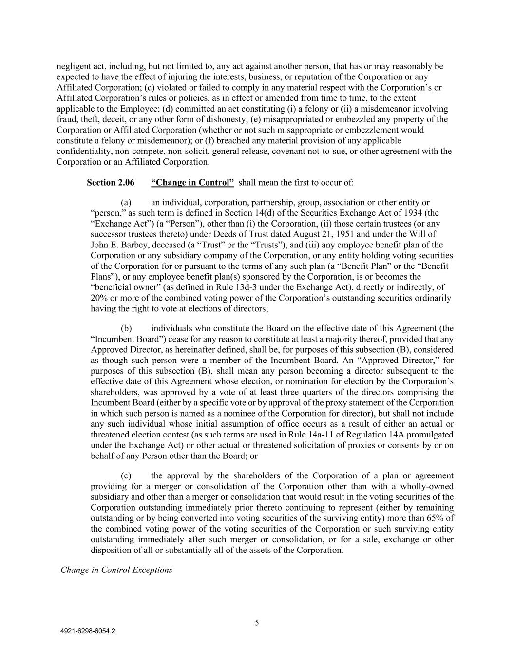5 4921-6298-6054.2 negligent act, including, but not limited to, any act against another person, that has or may reasonably be expected to have the effect of injuring the interests, business, or reputation of the Corporation or any Affiliated Corporation; (c) violated or failed to comply in any material respect with the Corporation’s or Affiliated Corporation’s rules or policies, as in effect or amended from time to time, to the extent applicable to the Employee; (d) committed an act constituting (i) a felony or (ii) a misdemeanor involving fraud, theft, deceit, or any other form of dishonesty; (e) misappropriated or embezzled any property of the Corporation or Affiliated Corporation (whether or not such misappropriate or embezzlement would constitute a felony or misdemeanor); or (f) breached any material provision of any applicable confidentiality, non-compete, non-solicit, general release, covenant not-to-sue, or other agreement with the Corporation or an Affiliated Corporation. “Change in Control” shall mean the first to occur of: (a) an individual, corporation, partnership, group, association or other entity or “person,” as such term is defined in Section 14(d) of the Securities Exchange Act of 1934 (the “Exchange Act”) (a “Person”), other than (i) the Corporation, (ii) those certain trustees (or any successor trustees thereto) under Deeds of Trust dated August 21, 1951 and under the Will of John E. Barbey, deceased (a “Trust” or the “Trusts”), and (iii) any employee benefit plan of the Corporation or any subsidiary company of the Corporation, or any entity holding voting securities of the Corporation for or pursuant to the terms of any such plan (a “Benefit Plan” or the “Benefit Plans”), or any employee benefit plan(s) sponsored by the Corporation, is or becomes the “beneficial owner” (as defined in Rule 13d-3 under the Exchange Act), directly or indirectly, of 20% or more of the combined voting power of the Corporation’s outstanding securities ordinarily having the right to vote at elections of directors; (b) individuals who constitute the Board on the effective date of this Agreement (the “Incumbent Board”) cease for any reason to constitute at least a majority thereof, provided that any Approved Director, as hereinafter defined, shall be, for purposes of this subsection (B), considered as though such person were a member of the Incumbent Board. An “Approved Director,” for purposes of this subsection (B), shall mean any person becoming a director subsequent to the effective date of this Agreement whose election, or nomination for election by the Corporation’s shareholders, was approved by a vote of at least three quarters of the directors comprising the Incumbent Board (either by a specific vote or by approval of the proxy statement of the Corporation in which such person is named as a nominee of the Corporation for director), but shall not include any such individual whose initial assumption of office occurs as a result of either an actual or threatened election contest (as such terms are used in Rule 14a-11 of Regulation 14A promulgated under the Exchange Act) or other actual or threatened solicitation of proxies or consents by or on behalf of any Person other than the Board; or (c) the approval by the shareholders of the Corporation of a plan or agreement providing for a merger or consolidation of the Corporation other than with a wholly-owned subsidiary and other than a merger or consolidation that would result in the voting securities of the Corporation outstanding immediately prior thereto continuing to represent (either by remaining outstanding or by being converted into voting securities of the surviving entity) more than 65% of the combined voting power of the voting securities of the Corporation or such surviving entity outstanding immediately after such merger or consolidation, or for a sale, exchange or other disposition of all or substantially all of the assets of the Corporation. Change in Control Exceptions