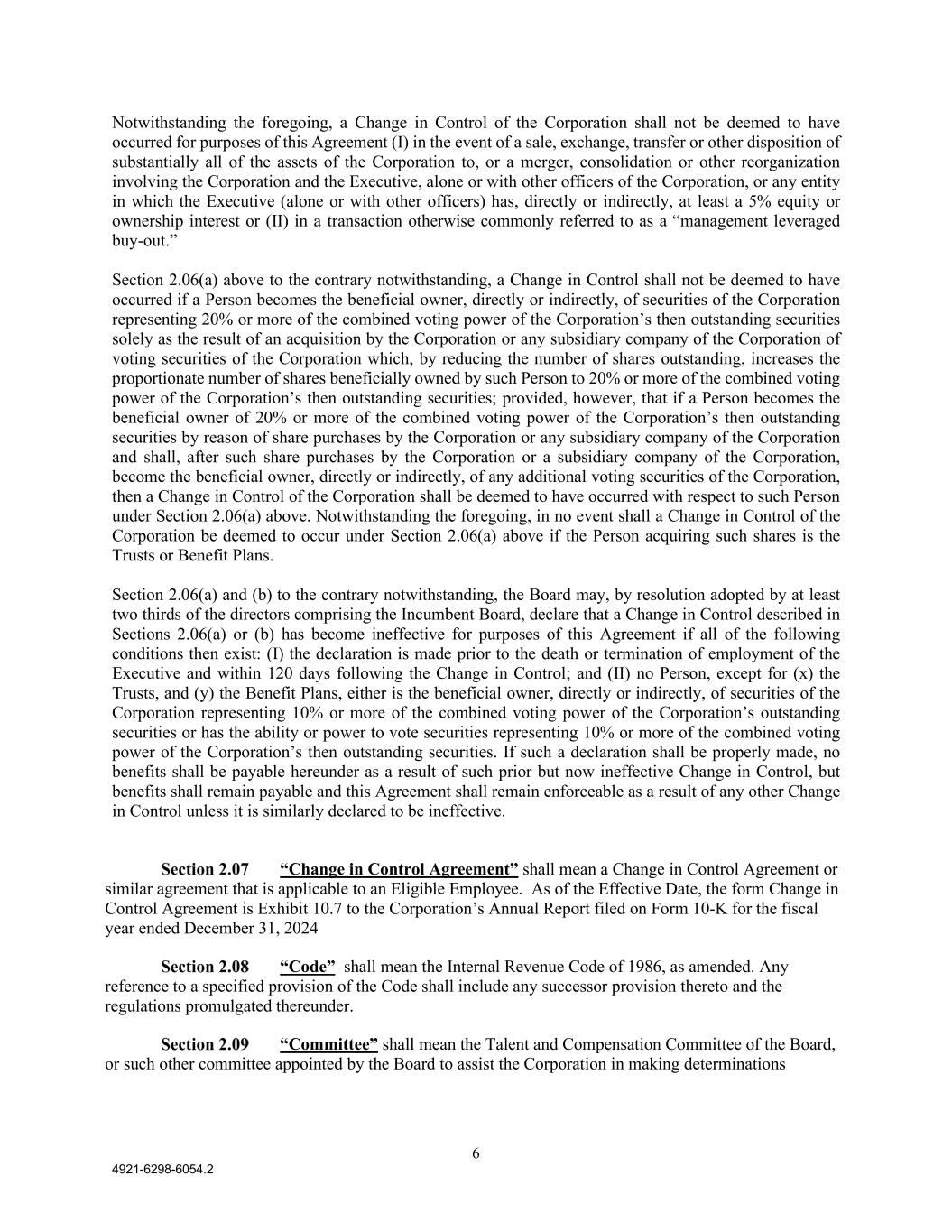6 4921-6298-6054.2 Notwithstanding the foregoing, a Change in Control of the Corporation shall not be deemed to have occurred for purposes of this Agreement (I) in the event of a sale, exchange, transfer or other disposition of substantially all of the assets of the Corporation to, or a merger, consolidation or other reorganization involving the Corporation and the Executive, alone or with other officers of the Corporation, or any entity in which the Executive (alone or with other officers) has, directly or indirectly, at least a 5% equity or ownership interest or (II) in a transaction otherwise commonly referred to as a “management leveraged buy-out.” Section 2.06(a) above to the contrary notwithstanding, a Change in Control shall not be deemed to have occurred if a Person becomes the beneficial owner, directly or indirectly, of securities of the Corporation representing 20% or more of the combined voting power of the Corporation’s then outstanding securities solely as the result of an acquisition by the Corporation or any subsidiary company of the Corporation of voting securities of the Corporation which, by reducing the number of shares outstanding, increases the proportionate number of shares beneficially owned by such Person to 20% or more of the combined voting power of the Corporation’s then outstanding securities; provided, however, that if a Person becomes the beneficial owner of 20% or more of the combined voting power of the Corporation’s then outstanding securities by reason of share purchases by the Corporation or any subsidiary company of the Corporation and shall, after such share purchases by the Corporation or a subsidiary company of the Corporation, become the beneficial owner, directly or indirectly, of any additional voting securities of the Corporation, then a Change in Control of the Corporation shall be deemed to have occurred with respect to such Person under Section 2.06(a) above. Notwithstanding the foregoing, in no event shall a Change in Control of the Corporation be deemed to occur under Section 2.06(a) above if the Person acquiring such shares is the Trusts or Benefit Plans. Section 2.06(a) and (b) to the contrary notwithstanding, the Board may, by resolution adopted by at least two thirds of the directors comprising the Incumbent Board, declare that a Change in Control described in Sections 2.06(a) or (b) has become ineffective for purposes of this Agreement if all of the following conditions then exist: (I) the declaration is made prior to the death or termination of employment of the Executive and within 120 days following the Change in Control; and (II) no Person, except for (x) the Trusts, and (y) the Benefit Plans, either is the beneficial owner, directly or indirectly, of securities of the Corporation representing 10% or more of the combined voting power of the Corporation’s outstanding securities or has the ability or power to vote securities representing 10% or more of the combined voting power of the Corporation’s then outstanding securities. If such a declaration shall be properly made, no benefits shall be payable hereunder as a result of such prior but now ineffective Change in Control, but benefits shall remain payable and this Agreement shall remain enforceable as a result of any other Change in Control unless it is similarly declared to be ineffective. “Change in Control Agreement” shall mean a Change in Control Agreement or similar agreement that is applicable to an Eligible Employee. As of the Effective Date, the form Change in Control Agreement is Exhibit 10.7 to the Corporation’s Annual Report filed on Form 10-K for the fiscal year ended December 31, 2024 “Code” shall mean the Internal Revenue Code of 1986, as amended. Any reference to a specified provision of the Code shall include any successor provision thereto and the regulations promulgated thereunder. “Committee” shall mean the Talent and Compensation Committee of the Board, or such other committee appointed by the Board to assist the Corporation in making determinations