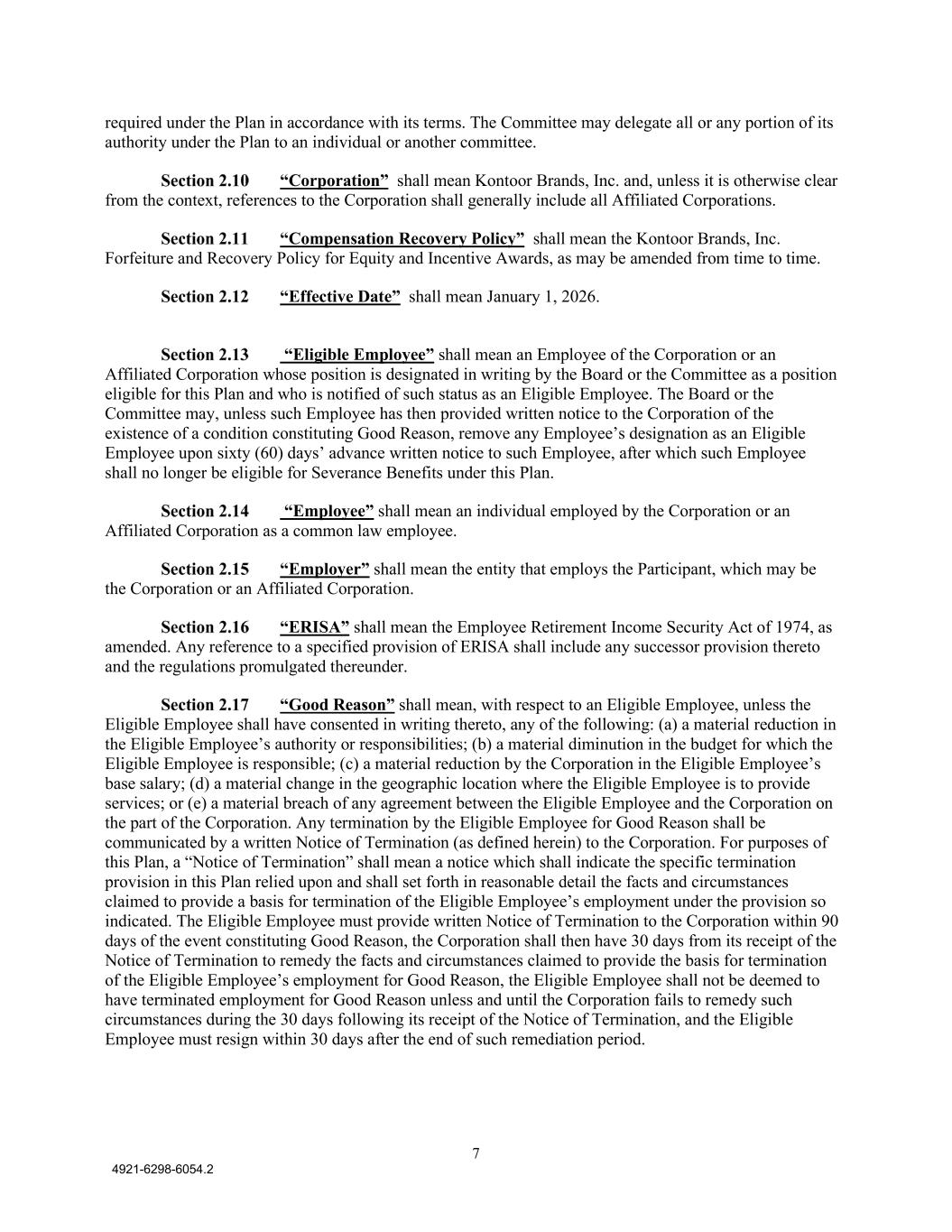 7 4921-6298-6054.2 required under the Plan in accordance with its terms. The Committee may delegate all or any portion of its authority under the Plan to an individual or another committee. “Corporation” shall mean Kontoor Brands, Inc. and, unless it is otherwise clear from the context, references to the Corporation shall generally include all Affiliated Corporations. “Compensation Recovery Policy” shall mean the Kontoor Brands, Inc. Forfeiture and Recovery Policy for Equity and Incentive Awards, as may be amended from time to time. “Effective Date” shall mean January 1, 2026. “Eligible Employee” shall mean an Employee of the Corporation or an Affiliated Corporation whose position is designated in writing by the Board or the Committee as a position eligible for this Plan and who is notified of such status as an Eligible Employee. The Board or the Committee may, unless such Employee has then provided written notice to the Corporation of the existence of a condition constituting Good Reason, remove any Employee’s designation as an Eligible Employee upon sixty (60) days’ advance written notice to such Employee, after which such Employee shall no longer be eligible for Severance Benefits under this Plan. “Employee” shall mean an individual employed by the Corporation or an Affiliated Corporation as a common law employee. “Employer” shall mean the entity that employs the Participant, which may be the Corporation or an Affiliated Corporation. “ERISA” shall mean the Employee Retirement Income Security Act of 1974, as amended. Any reference to a specified provision of ERISA shall include any successor provision thereto and the regulations promulgated thereunder. “Good Reason” shall mean, with respect to an Eligible Employee, unless the Eligible Employee shall have consented in writing thereto, any of the following: (a) a material reduction in the Eligible Employee’s authority or responsibilities; (b) a material diminution in the budget for which the Eligible Employee is responsible; (c) a material reduction by the Corporation in the Eligible Employee’s base salary; (d) a material change in the geographic location where the Eligible Employee is to provide services; or (e) a material breach of any agreement between the Eligible Employee and the Corporation on the part of the Corporation. Any termination by the Eligible Employee for Good Reason shall be communicated by a written Notice of Termination (as defined herein) to the Corporation. For purposes of this Plan, a “Notice of Termination” shall mean a notice which shall indicate the specific termination provision in this Plan relied upon and shall set forth in reasonable detail the facts and circumstances claimed to provide a basis for termination of the Eligible Employee’s employment under the provision so indicated. The Eligible Employee must provide written Notice of Termination to the Corporation within 90 days of the event constituting Good Reason, the Corporation shall then have 30 days from its receipt of the Notice of Termination to remedy the facts and circumstances claimed to provide the basis for termination of the Eligible Employee’s employment for Good Reason, the Eligible Employee shall not be deemed to have terminated employment for Good Reason unless and until the Corporation fails to remedy such circumstances during the 30 days following its receipt of the Notice of Termination, and the Eligible Employee must resign within 30 days after the end of such remediation period.