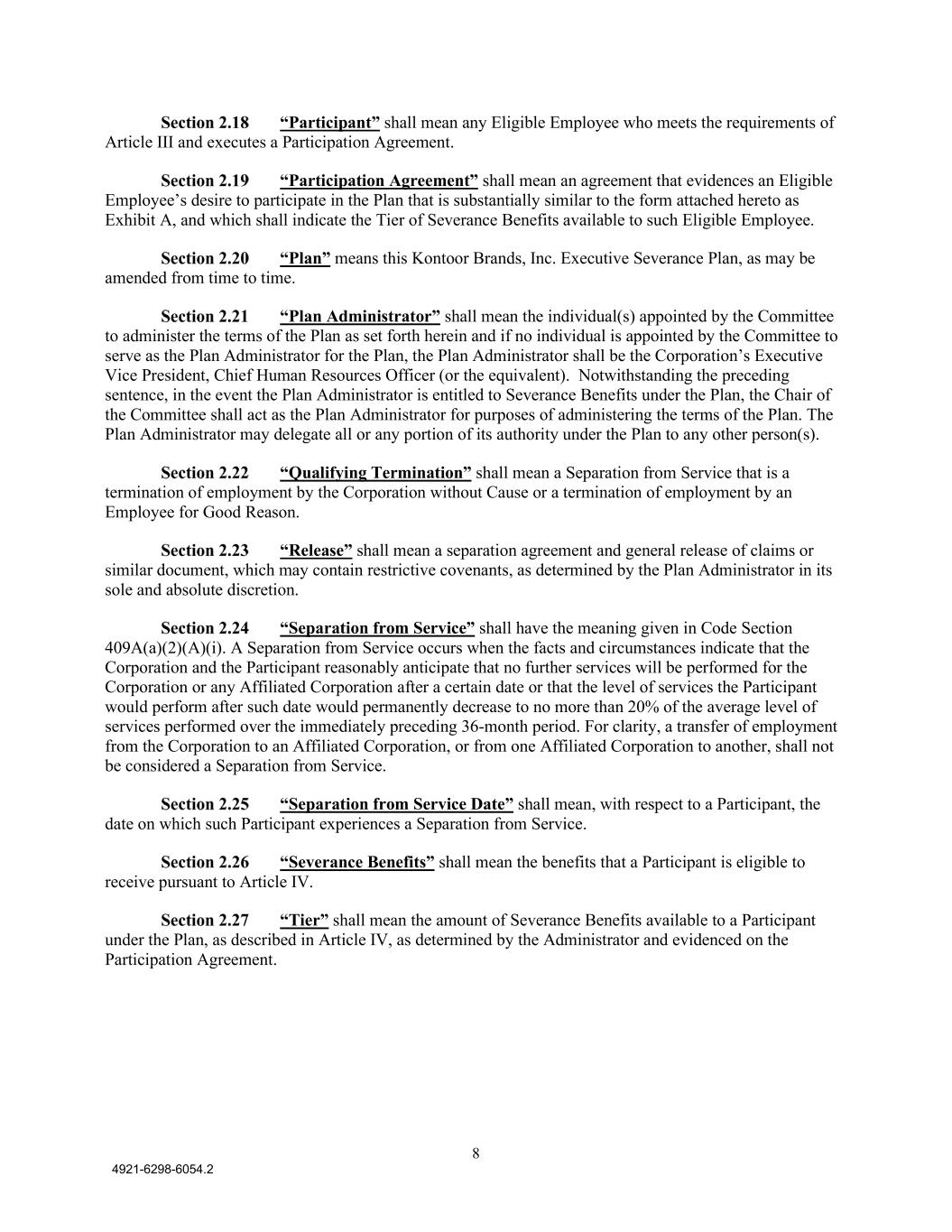 8 4921-6298-6054.2 “Participant” shall mean any Eligible Employee who meets the requirements of Article III and executes a Participation Agreement. “Participation Agreement” shall mean an agreement that evidences an Eligible Employee’s desire to participate in the Plan that is substantially similar to the form attached hereto as Exhibit A, and which shall indicate the Tier of Severance Benefits available to such Eligible Employee. “Plan” means this Kontoor Brands, Inc. Executive Severance Plan, as may be amended from time to time. “Plan Administrator” shall mean the individual(s) appointed by the Committee to administer the terms of the Plan as set forth herein and if no individual is appointed by the Committee to serve as the Plan Administrator for the Plan, the Plan Administrator shall be the Corporation’s Executive Vice President, Chief Human Resources Officer (or the equivalent). Notwithstanding the preceding sentence, in the event the Plan Administrator is entitled to Severance Benefits under the Plan, the Chair of the Committee shall act as the Plan Administrator for purposes of administering the terms of the Plan. The Plan Administrator may delegate all or any portion of its authority under the Plan to any other person(s). “Qualifying Termination” shall mean a Separation from Service that is a termination of employment by the Corporation without Cause or a termination of employment by an Employee for Good Reason. “Release” shall mean a separation agreement and general release of claims or similar document, which may contain restrictive covenants, as determined by the Plan Administrator in its sole and absolute discretion. “Separation from Service” shall have the meaning given in Code Section 409A(a)(2)(A)(i). A Separation from Service occurs when the facts and circumstances indicate that the Corporation and the Participant reasonably anticipate that no further services will be performed for the Corporation or any Affiliated Corporation after a certain date or that the level of services the Participant would perform after such date would permanently decrease to no more than 20% of the average level of services performed over the immediately preceding 36-month period. For clarity, a transfer of employment from the Corporation to an Affiliated Corporation, or from one Affiliated Corporation to another, shall not be considered a Separation from Service. “Separation from Service Date” shall mean, with respect to a Participant, the date on which such Participant experiences a Separation from Service. “Severance Benefits” shall mean the benefits that a Participant is eligible to receive pursuant to Article IV. “Tier” shall mean the amount of Severance Benefits available to a Participant under the Plan, as described in Article IV, as determined by the Administrator and evidenced on the Participation Agreement.