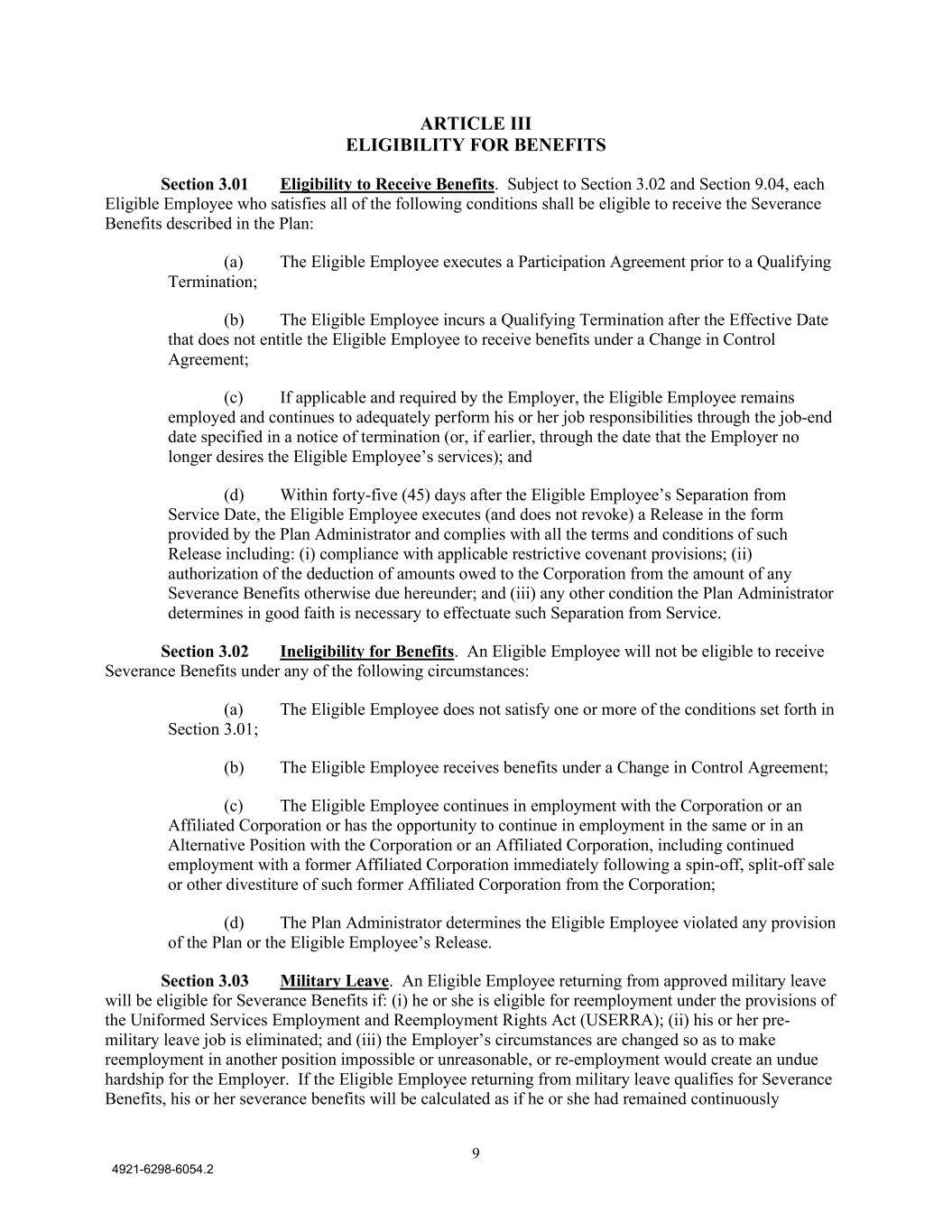 9 4921-6298-6054.2 ELIGIBILITY FOR BENEFITS Eligibility to Receive Benefits. Subject to Section 3.02 and Section 9.04, each Eligible Employee who satisfies all of the following conditions shall be eligible to receive the Severance Benefits described in the Plan: (a) The Eligible Employee executes a Participation Agreement prior to a Qualifying Termination; (b) The Eligible Employee incurs a Qualifying Termination after the Effective Date that does not entitle the Eligible Employee to receive benefits under a Change in Control Agreement; (c) If applicable and required by the Employer, the Eligible Employee remains employed and continues to adequately perform his or her job responsibilities through the job-end date specified in a notice of termination (or, if earlier, through the date that the Employer no longer desires the Eligible Employee’s services); and (d) Within forty-five (45) days after the Eligible Employee’s Separation from Service Date, the Eligible Employee executes (and does not revoke) a Release in the form provided by the Plan Administrator and complies with all the terms and conditions of such Release including: (i) compliance with applicable restrictive covenant provisions; (ii) authorization of the deduction of amounts owed to the Corporation from the amount of any Severance Benefits otherwise due hereunder; and (iii) any other condition the Plan Administrator determines in good faith is necessary to effectuate such Separation from Service. Ineligibility for Benefits. An Eligible Employee will not be eligible to receive Severance Benefits under any of the following circumstances: (a) The Eligible Employee does not satisfy one or more of the conditions set forth in Section 3.01; (b) The Eligible Employee receives benefits under a Change in Control Agreement; (c) The Eligible Employee continues in employment with the Corporation or an Affiliated Corporation or has the opportunity to continue in employment in the same or in an Alternative Position with the Corporation or an Affiliated Corporation, including continued employment with a former Affiliated Corporation immediately following a spin-off, split-off sale or other divestiture of such former Affiliated Corporation from the Corporation; (d) The Plan Administrator determines the Eligible Employee violated any provision of the Plan or the Eligible Employee’s Release. Military Leave. An Eligible Employee returning from approved military leave will be eligible for Severance Benefits if: (i) he or she is eligible for reemployment under the provisions of the Uniformed Services Employment and Reemployment Rights Act (USERRA); (ii) his or her pre- military leave job is eliminated; and (iii) the Employer’s circumstances are changed so as to make reemployment in another position impossible or unreasonable, or re-employment would create an undue hardship for the Employer. If the Eligible Employee returning from military leave qualifies for Severance Benefits, his or her severance benefits will be calculated as if he or she had remained continuously