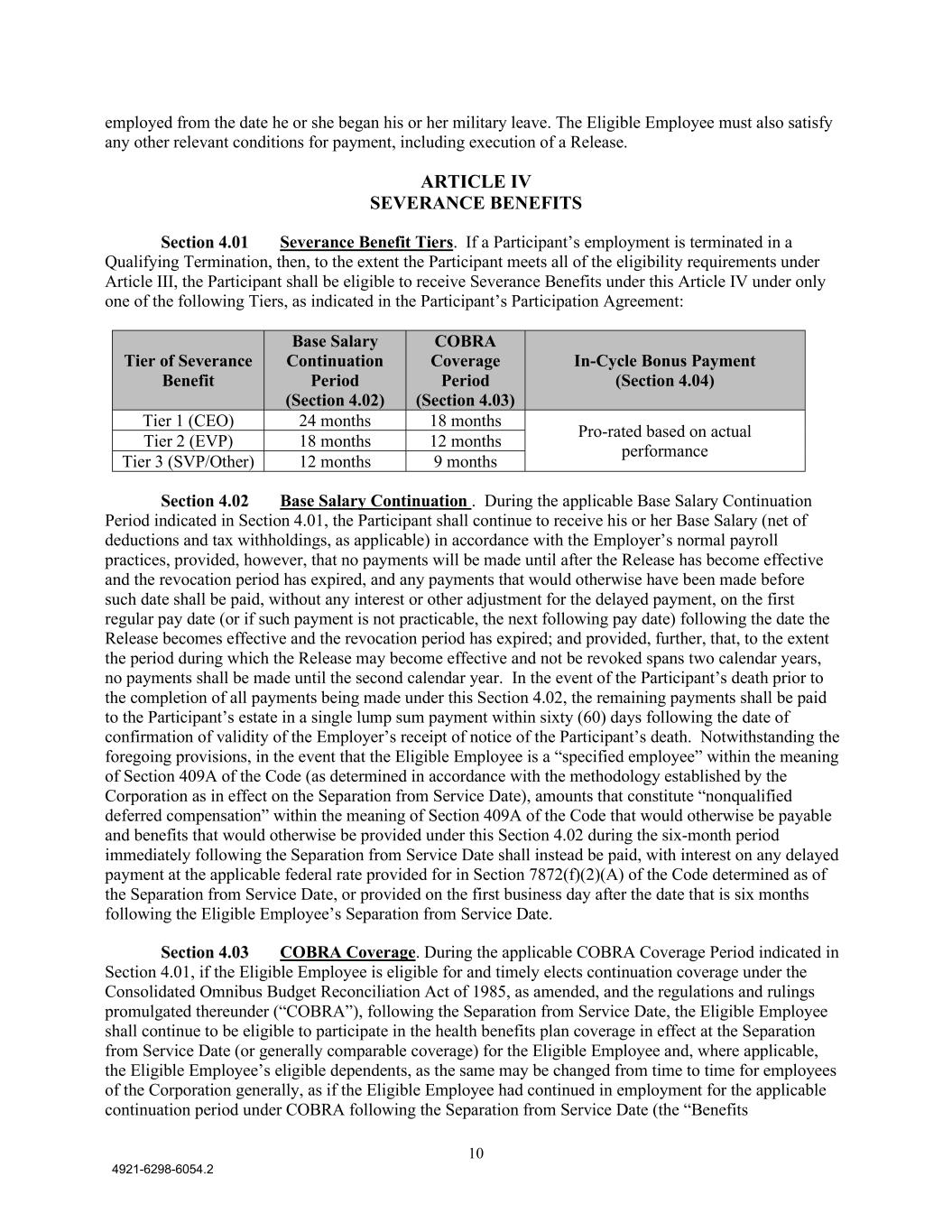 10 4921-6298-6054.2 employed from the date he or she began his or her military leave. The Eligible Employee must also satisfy any other relevant conditions for payment, including execution of a Release. SEVERANCE BENEFITS Severance Benefit Tiers. If a Participant’s employment is terminated in a Qualifying Termination, then, to the extent the Participant meets all of the eligibility requirements under Article III, the Participant shall be eligible to receive Severance Benefits under this Article IV under only one of the following Tiers, as indicated in the Participant’s Participation Agreement: Tier of Severance Benefit Base Salary Continuation Period (Section 4.02) COBRA Coverage Period (Section 4.03) In-Cycle Bonus Payment (Section 4.04) Tier 1 (CEO) 24 months 18 months Pro-rated based on actual performance Tier 2 (EVP) 18 months 12 months Tier 3 (SVP/Other) 12 months 9 months Base Salary Continuation . During the applicable Base Salary Continuation Period indicated in Section 4.01, the Participant shall continue to receive his or her Base Salary (net of deductions and tax withholdings, as applicable) in accordance with the Employer’s normal payroll practices, provided, however, that no payments will be made until after the Release has become effective and the revocation period has expired, and any payments that would otherwise have been made before such date shall be paid, without any interest or other adjustment for the delayed payment, on the first regular pay date (or if such payment is not practicable, the next following pay date) following the date the Release becomes effective and the revocation period has expired; and provided, further, that, to the extent the period during which the Release may become effective and not be revoked spans two calendar years, no payments shall be made until the second calendar year. In the event of the Participant’s death prior to the completion of all payments being made under this Section 4.02, the remaining payments shall be paid to the Participant’s estate in a single lump sum payment within sixty (60) days following the date of confirmation of validity of the Employer’s receipt of notice of the Participant’s death. Notwithstanding the foregoing provisions, in the event that the Eligible Employee is a “specified employee” within the meaning of Section 409A of the Code (as determined in accordance with the methodology established by the Corporation as in effect on the Separation from Service Date), amounts that constitute “nonqualified deferred compensation” within the meaning of Section 409A of the Code that would otherwise be payable and benefits that would otherwise be provided under this Section 4.02 during the six-month period immediately following the Separation from Service Date shall instead be paid, with interest on any delayed payment at the applicable federal rate provided for in Section 7872(f)(2)(A) of the Code determined as of the Separation from Service Date, or provided on the first business day after the date that is six months following the Eligible Employee’s Separation from Service Date. COBRA Coverage. During the applicable COBRA Coverage Period indicated in Section 4.01, if the Eligible Employee is eligible for and timely elects continuation coverage under the Consolidated Omnibus Budget Reconciliation Act of 1985, as amended, and the regulations and rulings promulgated thereunder (“COBRA”), following the Separation from Service Date, the Eligible Employee shall continue to be eligible to participate in the health benefits plan coverage in effect at the Separation from Service Date (or generally comparable coverage) for the Eligible Employee and, where applicable, the Eligible Employee’s eligible dependents, as the same may be changed from time to time for employees of the Corporation generally, as if the Eligible Employee had continued in employment for the applicable continuation period under COBRA following the Separation from Service Date (the “Benefits