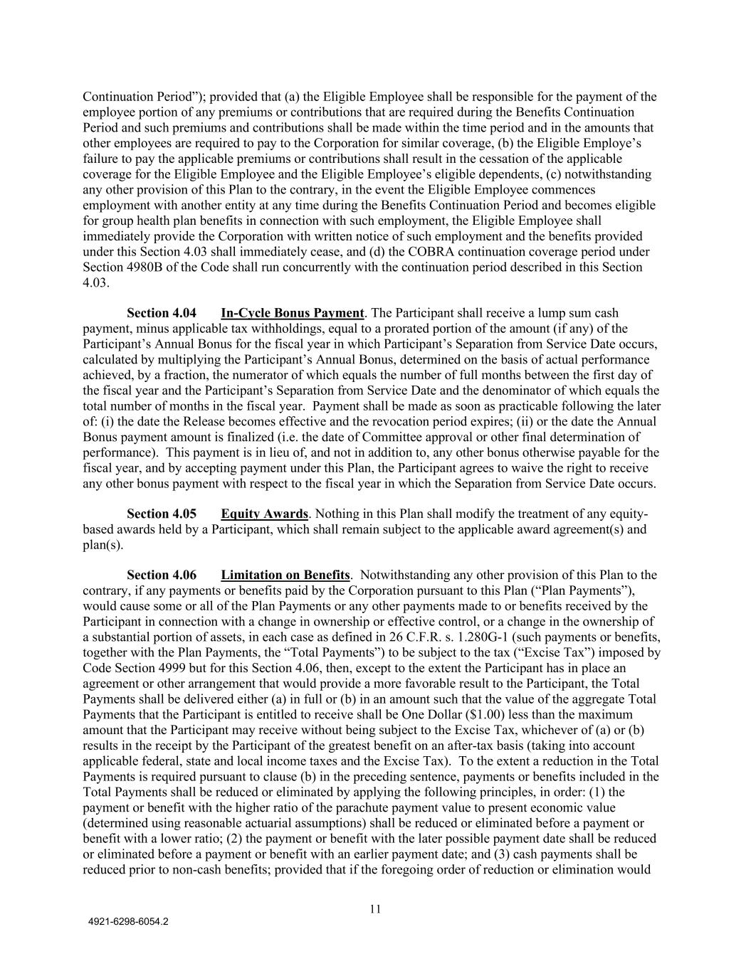 11 4921-6298-6054.2 Continuation Period”); provided that (a) the Eligible Employee shall be responsible for the payment of the employee portion of any premiums or contributions that are required during the Benefits Continuation Period and such premiums and contributions shall be made within the time period and in the amounts that other employees are required to pay to the Corporation for similar coverage, (b) the Eligible Employe’s failure to pay the applicable premiums or contributions shall result in the cessation of the applicable coverage for the Eligible Employee and the Eligible Employee’s eligible dependents, (c) notwithstanding any other provision of this Plan to the contrary, in the event the Eligible Employee commences employment with another entity at any time during the Benefits Continuation Period and becomes eligible for group health plan benefits in connection with such employment, the Eligible Employee shall immediately provide the Corporation with written notice of such employment and the benefits provided under this Section 4.03 shall immediately cease, and (d) the COBRA continuation coverage period under Section 4980B of the Code shall run concurrently with the continuation period described in this Section 4.03. In-Cycle Bonus Payment. The Participant shall receive a lump sum cash payment, minus applicable tax withholdings, equal to a prorated portion of the amount (if any) of the Participant’s Annual Bonus for the fiscal year in which Participant’s Separation from Service Date occurs, calculated by multiplying the Participant’s Annual Bonus, determined on the basis of actual performance achieved, by a fraction, the numerator of which equals the number of full months between the first day of the fiscal year and the Participant’s Separation from Service Date and the denominator of which equals the total number of months in the fiscal year. Payment shall be made as soon as practicable following the later of: (i) the date the Release becomes effective and the revocation period expires; (ii) or the date the Annual Bonus payment amount is finalized (i.e. the date of Committee approval or other final determination of performance). This payment is in lieu of, and not in addition to, any other bonus otherwise payable for the fiscal year, and by accepting payment under this Plan, the Participant agrees to waive the right to receive any other bonus payment with respect to the fiscal year in which the Separation from Service Date occurs. Equity Awards. Nothing in this Plan shall modify the treatment of any equity- based awards held by a Participant, which shall remain subject to the applicable award agreement(s) and plan(s). Limitation on Benefits. Notwithstanding any other provision of this Plan to the contrary, if any payments or benefits paid by the Corporation pursuant to this Plan (“Plan Payments”), would cause some or all of the Plan Payments or any other payments made to or benefits received by the Participant in connection with a change in ownership or effective control, or a change in the ownership of a substantial portion of assets, in each case as defined in 26 C.F.R. s. 1.280G-1 (such payments or benefits, together with the Plan Payments, the “Total Payments”) to be subject to the tax (“Excise Tax”) imposed by Code Section 4999 but for this Section 4.06, then, except to the extent the Participant has in place an agreement or other arrangement that would provide a more favorable result to the Participant, the Total Payments shall be delivered either (a) in full or (b) in an amount such that the value of the aggregate Total Payments that the Participant is entitled to receive shall be One Dollar ($1.00) less than the maximum amount that the Participant may receive without being subject to the Excise Tax, whichever of (a) or (b) results in the receipt by the Participant of the greatest benefit on an after-tax basis (taking into account applicable federal, state and local income taxes and the Excise Tax). To the extent a reduction in the Total Payments is required pursuant to clause (b) in the preceding sentence, payments or benefits included in the Total Payments shall be reduced or eliminated by applying the following principles, in order: (1) the payment or benefit with the higher ratio of the parachute payment value to present economic value (determined using reasonable actuarial assumptions) shall be reduced or eliminated before a payment or benefit with a lower ratio; (2) the payment or benefit with the later possible payment date shall be reduced or eliminated before a payment or benefit with an earlier payment date; and (3) cash payments shall be reduced prior to non-cash benefits; provided that if the foregoing order of reduction or elimination would