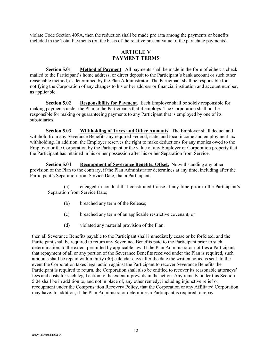 12 4921-6298-6054.2 violate Code Section 409A, then the reduction shall be made pro rata among the payments or benefits included in the Total Payments (on the basis of the relative present value of the parachute payments). PAYMENT TERMS Method of Payment. All payments shall be made in the form of either: a check mailed to the Participant’s home address, or direct deposit to the Participant’s bank account or such other reasonable method, as determined by the Plan Administrator. The Participant shall be responsible for notifying the Corporation of any changes to his or her address or financial institution and account number, as applicable. Responsibility for Payment. Each Employer shall be solely responsible for making payments under the Plan to the Participants that it employs. The Corporation shall not be responsible for making or guaranteeing payments to any Participant that is employed by one of its subsidiaries. Withholding of Taxes and Other Amounts. The Employer shall deduct and withhold from any Severance Benefits any required Federal, state, and local income and employment tax withholding. In addition, the Employer reserves the right to make deductions for any monies owed to the Employer or the Corporation by the Participant or the value of any Employer or Corporation property that the Participant has retained in his or her possession after his or her Separation from Service. Recoupment of Severance Benefits; Offset. Notwithstanding any other provision of the Plan to the contrary, if the Plan Administrator determines at any time, including after the Participant’s Separation from Service Date, that a Participant: (a) engaged in conduct that constituted Cause at any time prior to the Participant’s Separation from Service Date; (b) breached any term of the Release; (c) breached any term of an applicable restrictive covenant; or (d) violated any material provision of the Plan, then all Severance Benefits payable to the Participant shall immediately cease or be forfeited, and the Participant shall be required to return any Severance Benefits paid to the Participant prior to such determination, to the extent permitted by applicable law. If the Plan Administrator notifies a Participant that repayment of all or any portion of the Severance Benefits received under the Plan is required, such amounts shall be repaid within thirty (30) calendar days after the date the written notice is sent. In the event the Corporation takes legal action against the Participant to recover Severance Benefits the Participant is required to return, the Corporation shall also be entitled to recover its reasonable attorneys’ fees and costs for such legal action to the extent it prevails in the action. Any remedy under this Section 5.04 shall be in addition to, and not in place of, any other remedy, including injunctive relief or recoupment under the Compensation Recovery Policy, that the Corporation or any Affiliated Corporation may have. In addition, if the Plan Administrator determines a Participant is required to repay