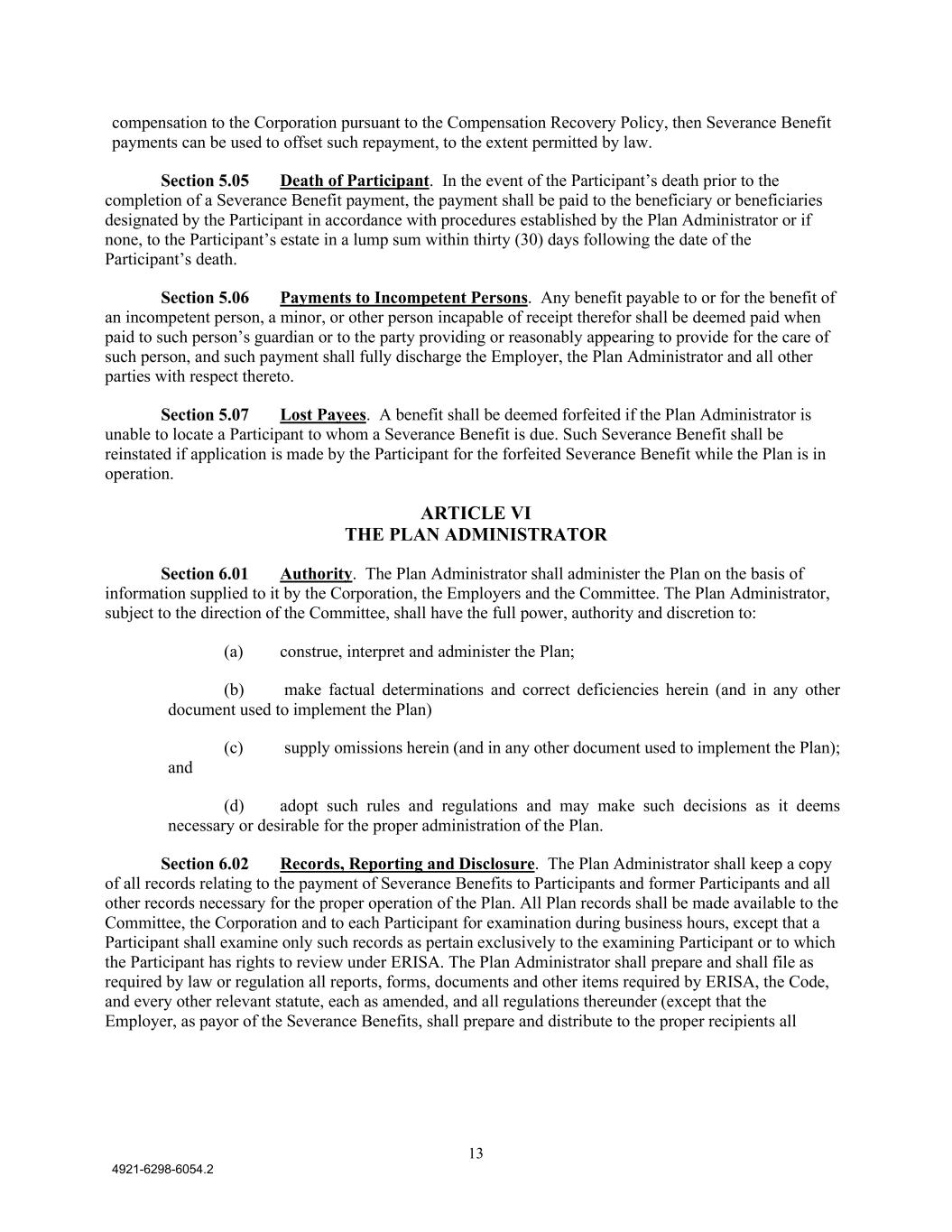 13 4921-6298-6054.2 compensation to the Corporation pursuant to the Compensation Recovery Policy, then Severance Benefit payments can be used to offset such repayment, to the extent permitted by law. Death of Participant. In the event of the Participant’s death prior to the completion of a Severance Benefit payment, the payment shall be paid to the beneficiary or beneficiaries designated by the Participant in accordance with procedures established by the Plan Administrator or if none, to the Participant’s estate in a lump sum within thirty (30) days following the date of the Participant’s death. Payments to Incompetent Persons. Any benefit payable to or for the benefit of an incompetent person, a minor, or other person incapable of receipt therefor shall be deemed paid when paid to such person’s guardian or to the party providing or reasonably appearing to provide for the care of such person, and such payment shall fully discharge the Employer, the Plan Administrator and all other parties with respect thereto. Lost Payees. A benefit shall be deemed forfeited if the Plan Administrator is unable to locate a Participant to whom a Severance Benefit is due. Such Severance Benefit shall be reinstated if application is made by the Participant for the forfeited Severance Benefit while the Plan is in operation. THE PLAN ADMINISTRATOR Authority. The Plan Administrator shall administer the Plan on the basis of information supplied to it by the Corporation, the Employers and the Committee. The Plan Administrator, subject to the direction of the Committee, shall have the full power, authority and discretion to: (a) construe, interpret and administer the Plan; (b) make factual determinations and correct deficiencies herein (and in any other document used to implement the Plan) (c) supply omissions herein (and in any other document used to implement the Plan); and (d) adopt such rules and regulations and may make such decisions as it deems necessary or desirable for the proper administration of the Plan. Records, Reporting and Disclosure. The Plan Administrator shall keep a copy of all records relating to the payment of Severance Benefits to Participants and former Participants and all other records necessary for the proper operation of the Plan. All Plan records shall be made available to the Committee, the Corporation and to each Participant for examination during business hours, except that a Participant shall examine only such records as pertain exclusively to the examining Participant or to which the Participant has rights to review under ERISA. The Plan Administrator shall prepare and shall file as required by law or regulation all reports, forms, documents and other items required by ERISA, the Code, and every other relevant statute, each as amended, and all regulations thereunder (except that the Employer, as payor of the Severance Benefits, shall prepare and distribute to the proper recipients all
