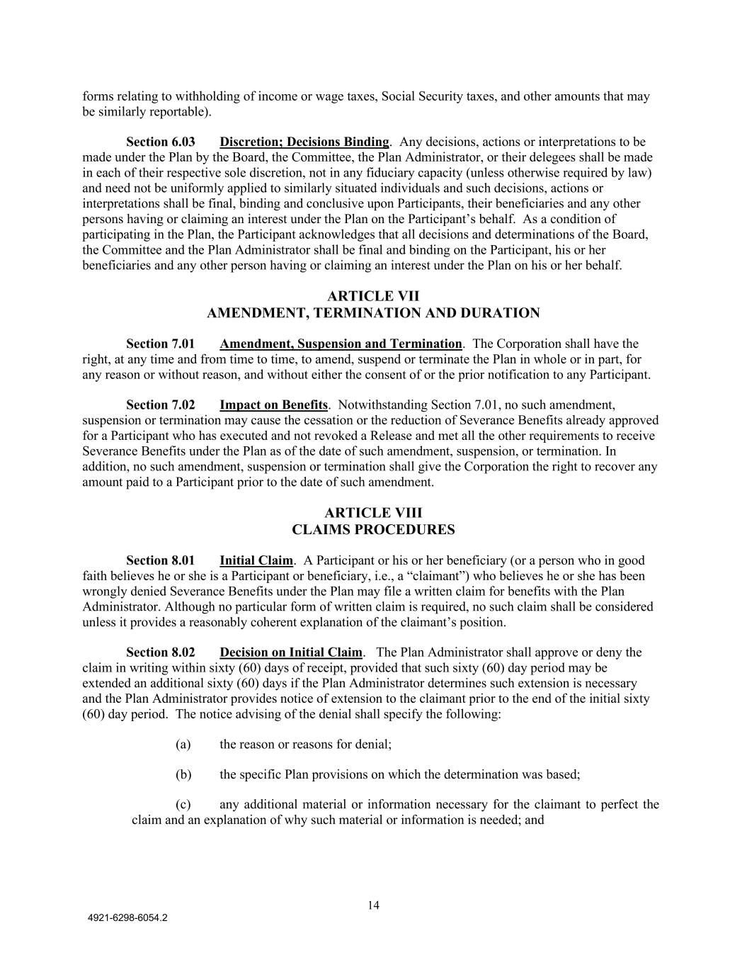 14 4921-6298-6054.2 forms relating to withholding of income or wage taxes, Social Security taxes, and other amounts that may be similarly reportable). Discretion; Decisions Binding. Any decisions, actions or interpretations to be made under the Plan by the Board, the Committee, the Plan Administrator, or their delegees shall be made in each of their respective sole discretion, not in any fiduciary capacity (unless otherwise required by law) and need not be uniformly applied to similarly situated individuals and such decisions, actions or interpretations shall be final, binding and conclusive upon Participants, their beneficiaries and any other persons having or claiming an interest under the Plan on the Participant’s behalf. As a condition of participating in the Plan, the Participant acknowledges that all decisions and determinations of the Board, the Committee and the Plan Administrator shall be final and binding on the Participant, his or her beneficiaries and any other person having or claiming an interest under the Plan on his or her behalf. AMENDMENT, TERMINATION AND DURATION Amendment, Suspension and Termination. The Corporation shall have the right, at any time and from time to time, to amend, suspend or terminate the Plan in whole or in part, for any reason or without reason, and without either the consent of or the prior notification to any Participant. Impact on Benefits. Notwithstanding Section 7.01, no such amendment, suspension or termination may cause the cessation or the reduction of Severance Benefits already approved for a Participant who has executed and not revoked a Release and met all the other requirements to receive Severance Benefits under the Plan as of the date of such amendment, suspension, or termination. In addition, no such amendment, suspension or termination shall give the Corporation the right to recover any amount paid to a Participant prior to the date of such amendment. CLAIMS PROCEDURES Initial Claim. A Participant or his or her beneficiary (or a person who in good faith believes he or she is a Participant or beneficiary, i.e., a “claimant”) who believes he or she has been wrongly denied Severance Benefits under the Plan may file a written claim for benefits with the Plan Administrator. Although no particular form of written claim is required, no such claim shall be considered unless it provides a reasonably coherent explanation of the claimant’s position. Decision on Initial Claim. The Plan Administrator shall approve or deny the claim in writing within sixty (60) days of receipt, provided that such sixty (60) day period may be extended an additional sixty (60) days if the Plan Administrator determines such extension is necessary and the Plan Administrator provides notice of extension to the claimant prior to the end of the initial sixty (60) day period. The notice advising of the denial shall specify the following: (a) the reason or reasons for denial; (b) the specific Plan provisions on which the determination was based; (c) any additional material or information necessary for the claimant to perfect the claim and an explanation of why such material or information is needed; and