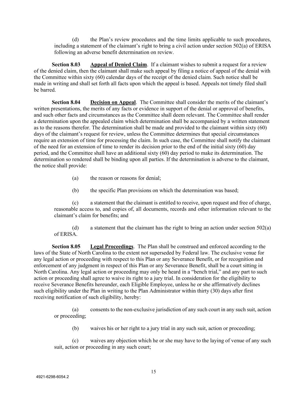 15 4921-6298-6054.2 (d) the Plan’s review procedures and the time limits applicable to such procedures, including a statement of the claimant’s right to bring a civil action under section 502(a) of ERISA following an adverse benefit determination on review. Appeal of Denied Claim. If a claimant wishes to submit a request for a review of the denied claim, then the claimant shall make such appeal by filing a notice of appeal of the denial with the Committee within sixty (60) calendar days of the receipt of the denied claim. Such notice shall be made in writing and shall set forth all facts upon which the appeal is based. Appeals not timely filed shall be barred. Decision on Appeal. The Committee shall consider the merits of the claimant’s written presentations, the merits of any facts or evidence in support of the denial or approval of benefits, and such other facts and circumstances as the Committee shall deem relevant. The Committee shall render a determination upon the appealed claim which determination shall be accompanied by a written statement as to the reasons therefor. The determination shall be made and provided to the claimant within sixty (60) days of the claimant’s request for review, unless the Committee determines that special circumstances require an extension of time for processing the claim. In such case, the Committee shall notify the claimant of the need for an extension of time to render its decision prior to the end of the initial sixty (60) day period, and the Committee shall have an additional sixty (60) day period to make its determination. The determination so rendered shall be binding upon all parties. If the determination is adverse to the claimant, the notice shall provide: (a) the reason or reasons for denial; (b) the specific Plan provisions on which the determination was based; (c) a statement that the claimant is entitled to receive, upon request and free of charge, reasonable access to, and copies of, all documents, records and other information relevant to the claimant’s claim for benefits; and (d) a statement that the claimant has the right to bring an action under section 502(a) of ERISA. Legal Proceedings. The Plan shall be construed and enforced according to the laws of the State of North Carolina to the extent not superseded by Federal law. The exclusive venue for any legal action or proceeding with respect to this Plan or any Severance Benefit, or for recognition and enforcement of any judgment in respect of this Plan or any Severance Benefit, shall be a court sitting in North Carolina. Any legal action or proceeding may only be heard in a “bench trial,” and any part to such action or proceeding shall agree to waive its right to a jury trial. In consideration for the eligibility to receive Severance Benefits hereunder, each Eligible Employee, unless he or she affirmatively declines such eligibility under the Plan in writing to the Plan Administrator within thirty (30) days after first receiving notification of such eligibility, hereby: (a) consents to the non-exclusive jurisdiction of any such court in any such suit, action or proceeding; (b) waives his or her right to a jury trial in any such suit, action or proceeding; (c) waives any objection which he or she may have to the laying of venue of any such suit, action or proceeding in any such court;