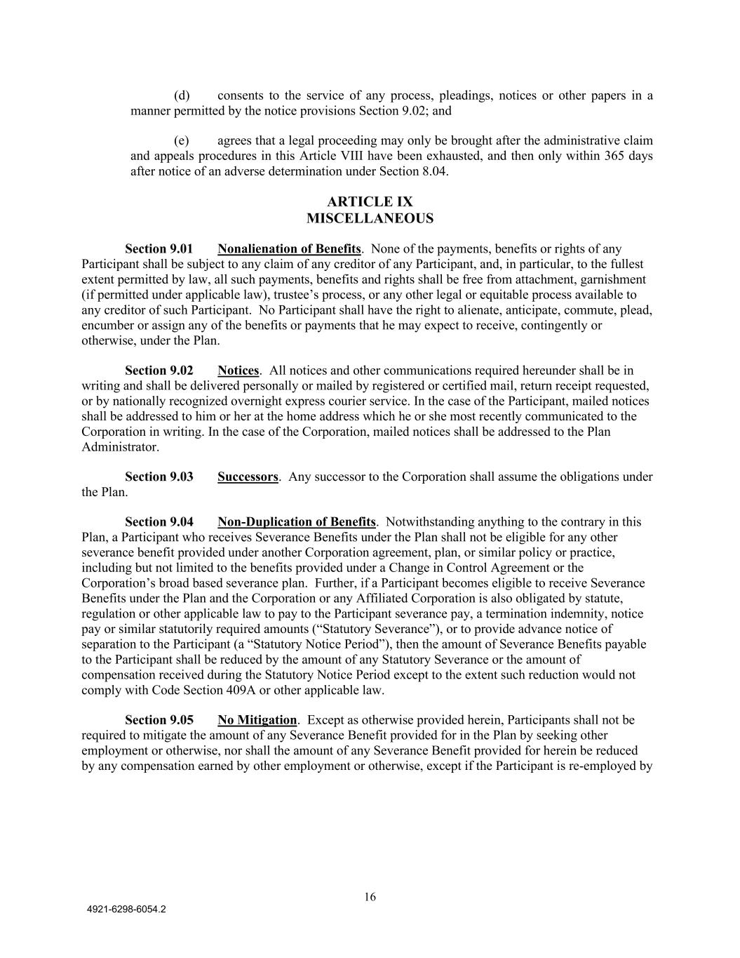 16 4921-6298-6054.2 (d) consents to the service of any process, pleadings, notices or other papers in a manner permitted by the notice provisions Section 9.02; and (e) agrees that a legal proceeding may only be brought after the administrative claim and appeals procedures in this Article VIII have been exhausted, and then only within 365 days after notice of an adverse determination under Section 8.04. MISCELLANEOUS Nonalienation of Benefits. None of the payments, benefits or rights of any Participant shall be subject to any claim of any creditor of any Participant, and, in particular, to the fullest extent permitted by law, all such payments, benefits and rights shall be free from attachment, garnishment (if permitted under applicable law), trustee’s process, or any other legal or equitable process available to any creditor of such Participant. No Participant shall have the right to alienate, anticipate, commute, plead, encumber or assign any of the benefits or payments that he may expect to receive, contingently or otherwise, under the Plan. Notices. All notices and other communications required hereunder shall be in writing and shall be delivered personally or mailed by registered or certified mail, return receipt requested, or by nationally recognized overnight express courier service. In the case of the Participant, mailed notices shall be addressed to him or her at the home address which he or she most recently communicated to the Corporation in writing. In the case of the Corporation, mailed notices shall be addressed to the Plan Administrator. Successors. Any successor to the Corporation shall assume the obligations under the Plan. Non-Duplication of Benefits. Notwithstanding anything to the contrary in this Plan, a Participant who receives Severance Benefits under the Plan shall not be eligible for any other severance benefit provided under another Corporation agreement, plan, or similar policy or practice, including but not limited to the benefits provided under a Change in Control Agreement or the Corporation’s broad based severance plan. Further, if a Participant becomes eligible to receive Severance Benefits under the Plan and the Corporation or any Affiliated Corporation is also obligated by statute, regulation or other applicable law to pay to the Participant severance pay, a termination indemnity, notice pay or similar statutorily required amounts (“Statutory Severance”), or to provide advance notice of separation to the Participant (a “Statutory Notice Period”), then the amount of Severance Benefits payable to the Participant shall be reduced by the amount of any Statutory Severance or the amount of compensation received during the Statutory Notice Period except to the extent such reduction would not comply with Code Section 409A or other applicable law. No Mitigation. Except as otherwise provided herein, Participants shall not be required to mitigate the amount of any Severance Benefit provided for in the Plan by seeking other employment or otherwise, nor shall the amount of any Severance Benefit provided for herein be reduced by any compensation earned by other employment or otherwise, except if the Participant is re-employed by