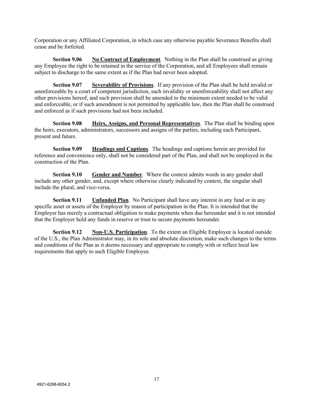 17 4921-6298-6054.2 Corporation or any Affiliated Corporation, in which case any otherwise payable Severance Benefits shall cease and be forfeited. No Contract of Employment. Nothing in the Plan shall be construed as giving any Employee the right to be retained in the service of the Corporation, and all Employees shall remain subject to discharge to the same extent as if the Plan had never been adopted. Severability of Provisions. If any provision of the Plan shall be held invalid or unenforceable by a court of competent jurisdiction, such invalidity or unenforceability shall not affect any other provisions hereof, and such provision shall be amended to the minimum extent needed to be valid and enforceable, or if such amendment is not permitted by applicable law, then the Plan shall be construed and enforced as if such provisions had not been included. Heirs, Assigns, and Personal Representatives. The Plan shall be binding upon the heirs, executors, administrators, successors and assigns of the parties, including each Participant, present and future. Headings and Captions. The headings and captions herein are provided for reference and convenience only, shall not be considered part of the Plan, and shall not be employed in the construction of the Plan. Gender and Number. Where the context admits words in any gender shall include any other gender, and, except where otherwise clearly indicated by context, the singular shall include the plural, and vice-versa. Unfunded Plan. No Participant shall have any interest in any fund or in any specific asset or assets of the Employer by reason of participation in the Plan. It is intended that the Employer has merely a contractual obligation to make payments when due hereunder and it is not intended that the Employer hold any funds in reserve or trust to secure payments hereunder. Non-U.S. Participation. To the extent an Eligible Employee is located outside of the U.S., the Plan Administrator may, in its sole and absolute discretion, make such changes to the terms and conditions of the Plan as it deems necessary and appropriate to comply with or reflect local law requirements that apply to such Eligible Employee.