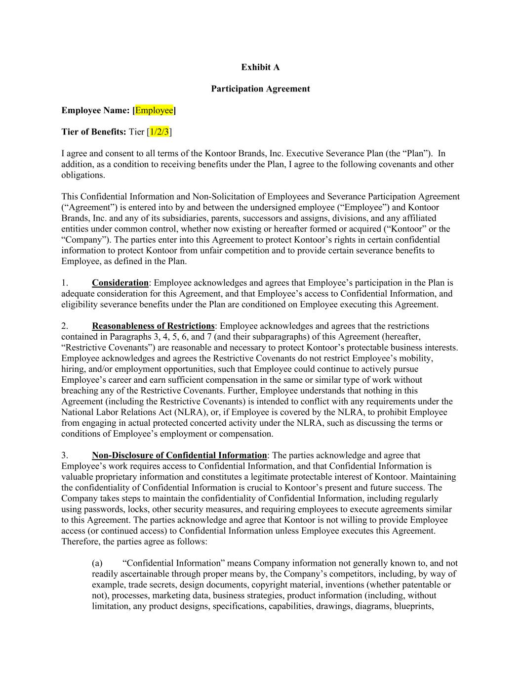 Exhibit A Participation Agreement Employee Name: [Employee] Tier of Benefits: Tier [1/2/3] I agree and consent to all terms of the Kontoor Brands, Inc. Executive Severance Plan (the “Plan”). In addition, as a condition to receiving benefits under the Plan, I agree to the following covenants and other obligations. This Confidential Information and Non-Solicitation of Employees and Severance Participation Agreement (“Agreement”) is entered into by and between the undersigned employee (“Employee”) and Kontoor Brands, Inc. and any of its subsidiaries, parents, successors and assigns, divisions, and any affiliated entities under common control, whether now existing or hereafter formed or acquired (“Kontoor” or the “Company”). The parties enter into this Agreement to protect Kontoor’s rights in certain confidential information to protect Kontoor from unfair competition and to provide certain severance benefits to Employee, as defined in the Plan. 1. Consideration: Employee acknowledges and agrees that Employee’s participation in the Plan is adequate consideration for this Agreement, and that Employee’s access to Confidential Information, and eligibility severance benefits under the Plan are conditioned on Employee executing this Agreement. 2. Reasonableness of Restrictions: Employee acknowledges and agrees that the restrictions contained in Paragraphs 3, 4, 5, 6, and 7 (and their subparagraphs) of this Agreement (hereafter, “Restrictive Covenants”) are reasonable and necessary to protect Kontoor’s protectable business interests. Employee acknowledges and agrees the Restrictive Covenants do not restrict Employee’s mobility, hiring, and/or employment opportunities, such that Employee could continue to actively pursue Employee’s career and earn sufficient compensation in the same or similar type of work without breaching any of the Restrictive Covenants. Further, Employee understands that nothing in this Agreement (including the Restrictive Covenants) is intended to conflict with any requirements under the National Labor Relations Act (NLRA), or, if Employee is covered by the NLRA, to prohibit Employee from engaging in actual protected concerted activity under the NLRA, such as discussing the terms or conditions of Employee’s employment or compensation. 3. Non-Disclosure of Confidential Information: The parties acknowledge and agree that Employee’s work requires access to Confidential Information, and that Confidential Information is valuable proprietary information and constitutes a legitimate protectable interest of Kontoor. Maintaining the confidentiality of Confidential Information is crucial to Kontoor’s present and future success. The Company takes steps to maintain the confidentiality of Confidential Information, including regularly using passwords, locks, other security measures, and requiring employees to execute agreements similar to this Agreement. The parties acknowledge and agree that Kontoor is not willing to provide Employee access (or continued access) to Confidential Information unless Employee executes this Agreement. Therefore, the parties agree as follows: (a) “Confidential Information” means Company information not generally known to, and not readily ascertainable through proper means by, the Company’s competitors, including, by way of example, trade secrets, design documents, copyright material, inventions (whether patentable or not), processes, marketing data, business strategies, product information (including, without limitation, any product designs, specifications, capabilities, drawings, diagrams, blueprints,