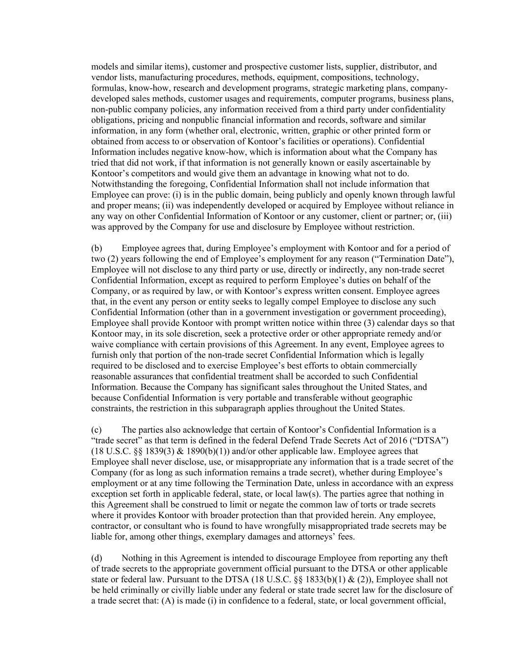 models and similar items), customer and prospective customer lists, supplier, distributor, and vendor lists, manufacturing procedures, methods, equipment, compositions, technology, formulas, know-how, research and development programs, strategic marketing plans, company- developed sales methods, customer usages and requirements, computer programs, business plans, non-public company policies, any information received from a third party under confidentiality obligations, pricing and nonpublic financial information and records, software and similar information, in any form (whether oral, electronic, written, graphic or other printed form or obtained from access to or observation of Kontoor’s facilities or operations). Confidential Information includes negative know-how, which is information about what the Company has tried that did not work, if that information is not generally known or easily ascertainable by Kontoor’s competitors and would give them an advantage in knowing what not to do. Notwithstanding the foregoing, Confidential Information shall not include information that Employee can prove: (i) is in the public domain, being publicly and openly known through lawful and proper means; (ii) was independently developed or acquired by Employee without reliance in any way on other Confidential Information of Kontoor or any customer, client or partner; or, (iii) was approved by the Company for use and disclosure by Employee without restriction. (b) Employee agrees that, during Employee’s employment with Kontoor and for a period of two (2) years following the end of Employee’s employment for any reason (“Termination Date”), Employee will not disclose to any third party or use, directly or indirectly, any non-trade secret Confidential Information, except as required to perform Employee’s duties on behalf of the Company, or as required by law, or with Kontoor’s express written consent. Employee agrees that, in the event any person or entity seeks to legally compel Employee to disclose any such Confidential Information (other than in a government investigation or government proceeding), Employee shall provide Kontoor with prompt written notice within three (3) calendar days so that Kontoor may, in its sole discretion, seek a protective order or other appropriate remedy and/or waive compliance with certain provisions of this Agreement. In any event, Employee agrees to furnish only that portion of the non-trade secret Confidential Information which is legally required to be disclosed and to exercise Employee’s best efforts to obtain commercially reasonable assurances that confidential treatment shall be accorded to such Confidential Information. Because the Company has significant sales throughout the United States, and because Confidential Information is very portable and transferable without geographic constraints, the restriction in this subparagraph applies throughout the United States. (c) The parties also acknowledge that certain of Kontoor’s Confidential Information is a “trade secret” as that term is defined in the federal Defend Trade Secrets Act of 2016 (“DTSA”) (18 U.S.C. §§ 1839(3) & 1890(b)(1)) and/or other applicable law. Employee agrees that Employee shall never disclose, use, or misappropriate any information that is a trade secret of the Company (for as long as such information remains a trade secret), whether during Employee’s employment or at any time following the Termination Date, unless in accordance with an express exception set forth in applicable federal, state, or local law(s). The parties agree that nothing in this Agreement shall be construed to limit or negate the common law of torts or trade secrets where it provides Kontoor with broader protection than that provided herein. Any employee, contractor, or consultant who is found to have wrongfully misappropriated trade secrets may be liable for, among other things, exemplary damages and attorneys’ fees. (d) Nothing in this Agreement is intended to discourage Employee from reporting any theft of trade secrets to the appropriate government official pursuant to the DTSA or other applicable state or federal law. Pursuant to the DTSA (18 U.S.C. §§ 1833(b)(1) & (2)), Employee shall not be held criminally or civilly liable under any federal or state trade secret law for the disclosure of a trade secret that: (A) is made (i) in confidence to a federal, state, or local government official,