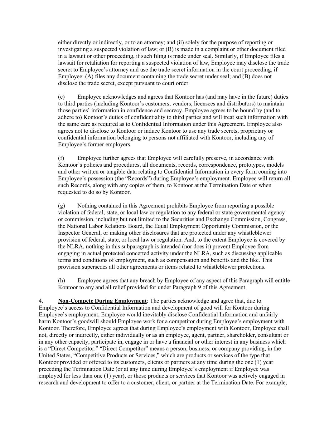 either directly or indirectly, or to an attorney; and (ii) solely for the purpose of reporting or investigating a suspected violation of law; or (B) is made in a complaint or other document filed in a lawsuit or other proceeding, if such filing is made under seal. Similarly, if Employee files a lawsuit for retaliation for reporting a suspected violation of law, Employee may disclose the trade secret to Employee’s attorney and use the trade secret information in the court proceeding, if Employee: (A) files any document containing the trade secret under seal; and (B) does not disclose the trade secret, except pursuant to court order. (e) Employee acknowledges and agrees that Kontoor has (and may have in the future) duties to third parties (including Kontoor’s customers, vendors, licensees and distributors) to maintain those parties’ information in confidence and secrecy. Employee agrees to be bound by (and to adhere to) Kontoor’s duties of confidentiality to third parties and will treat such information with the same care as required as to Confidential Information under this Agreement. Employee also agrees not to disclose to Kontoor or induce Kontoor to use any trade secrets, proprietary or confidential information belonging to persons not affiliated with Kontoor, including any of Employee’s former employers. (f) Employee further agrees that Employee will carefully preserve, in accordance with Kontoor’s policies and procedures, all documents, records, correspondence, prototypes, models and other written or tangible data relating to Confidential Information in every form coming into Employee’s possession (the “Records”) during Employee’s employment. Employee will return all such Records, along with any copies of them, to Kontoor at the Termination Date or when requested to do so by Kontoor. (g) Nothing contained in this Agreement prohibits Employee from reporting a possible violation of federal, state, or local law or regulation to any federal or state governmental agency or commission, including but not limited to the Securities and Exchange Commission, Congress, the National Labor Relations Board, the Equal Employment Opportunity Commission, or the Inspector General, or making other disclosures that are protected under any whistleblower provision of federal, state, or local law or regulation. And, to the extent Employee is covered by the NLRA, nothing in this subparagraph is intended (nor does it) prevent Employee from engaging in actual protected concerted activity under the NLRA, such as discussing applicable terms and conditions of employment, such as compensation and benefits and the like. This provision supersedes all other agreements or items related to whistleblower protections. (h) Employee agrees that any breach by Employee of any aspect of this Paragraph will entitle Kontoor to any and all relief provided for under Paragraph 9 of this Agreement. 4. Non-Compete During Employment: The parties acknowledge and agree that, due to Employee’s access to Confidential Information and development of good will for Kontoor during Employee’s employment, Employee would inevitably disclose Confidential Information and unfairly harm Kontoor’s goodwill should Employee work for a competitor during Employee’s employment with Kontoor. Therefore, Employee agrees that during Employee’s employment with Kontoor, Employee shall not, directly or indirectly, either individually or as an employee, agent, partner, shareholder, consultant or in any other capacity, participate in, engage in or have a financial or other interest in any business which is a “Direct Competitor.” “Direct Competitor” means a person, business, or company providing, in the United States, “Competitive Products or Services,” which are products or services of the type that Kontoor provided or offered to its customers, clients or partners at any time during the one (1) year preceding the Termination Date (or at any time during Employee’s employment if Employee was employed for less than one (1) year), or those products or services that Kontoor was actively engaged in research and development to offer to a customer, client, or partner at the Termination Date. For example,