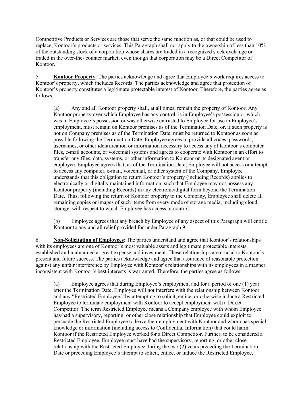 Competitive Products or Services are those that serve the same function as, or that could be used to replace, Kontoor’s products or services. This Paragraph shall not apply to the ownership of less than 10% of the outstanding stock of a corporation whose shares are traded in a recognized stock exchange or traded in the over-the- counter market, even though that corporation may be a Direct Competitor of Kontoor. 5. Kontoor Property: The parties acknowledge and agree that Employee’s work requires access to Kontoor’s property, which includes Records. The parties acknowledge and agree that protection of Kontoor’s property constitutes a legitimate protectable interest of Kontoor. Therefore, the parties agree as follows: (a) Any and all Kontoor property shall, at all times, remain the property of Kontoor. Any Kontoor property over which Employee has any control, is in Employee’s possession or which was in Employee’s possession or was otherwise entrusted to Employee for use in Employee’s employment, must remain on Kontoor premises as of the Termination Date, or, if such property is not on Company premises as of the Termination Date, must be returned to Kontoor as soon as possible following the Termination Date. Employee agrees to provide all codes, passwords, usernames, or other identification or information necessary to access any of Kontoor’s computer files, e-mail accounts, or voicemail systems and agrees to cooperate with Kontoor in an effort to transfer any files, data, systems, or other information to Kontoor or its designated agent or employee. Employee agrees that, as of the Termination Date, Employee will not access or attempt to access any computer, e-mail, voicemail, or other system of the Company. Employee understands that this obligation to return Kontoor’s property (including Records) applies to electronically or digitally maintained information, such that Employee may not possess any Kontoor property (including Records) in any electronic/digital form beyond the Termination Date. Thus, following the return of Kontoor property to the Company, Employee shall delete all remaining copies or images of such items from every mode of storage media, including cloud storage, with respect to which Employee has access or control. (b) Employee agrees that any breach by Employee of any aspect of this Paragraph will entitle Kontoor to any and all relief provided for under Paragraph 9. 6. Non-Solicitation of Employees: The parties understand and agree that Kontoor’s relationships with its employees are one of Kontoor’s most valuable assets and legitimate protectable interests, established and maintained at great expense and investment. These relationships are crucial to Kontoor’s present and future success. The parties acknowledge and agree that assurance of reasonable protection against any unfair interference by Employee with Kontoor’s relationships with its employees in a manner inconsistent with Kontoor’s best interests is warranted. Therefore, the parties agree as follows: (a) Employee agrees that during Employee’s employment and for a period of one (1) year after the Termination Date, Employee will not interfere with the relationship between Kontoor and any “Restricted Employee,” by attempting to solicit, entice, or otherwise induce a Restricted Employee to terminate employment with Kontoor to accept employment with a Direct Competitor. The term Restricted Employee means a Company employee with whom Employee has/had a supervisory, reporting, or other close relationship that Employee could exploit to persuade the Restricted Employee to leave their employment with Kontoor and whom has special knowledge or information (including access to Confidential Information) that could harm Kontoor if the Restricted Employee worked for a Direct Competitor. Further, to be considered a Restricted Employee, Employee must have had the supervisory, reporting, or other close relationship with the Restricted Employee during the two (2) years preceding the Termination Date or preceding Employee’s attempt to solicit, entice, or induce the Restricted Employee,