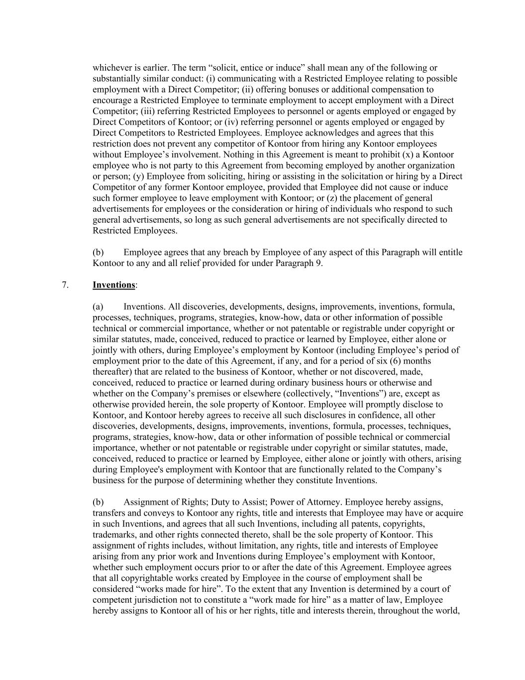 whichever is earlier. The term “solicit, entice or induce” shall mean any of the following or substantially similar conduct: (i) communicating with a Restricted Employee relating to possible employment with a Direct Competitor; (ii) offering bonuses or additional compensation to encourage a Restricted Employee to terminate employment to accept employment with a Direct Competitor; (iii) referring Restricted Employees to personnel or agents employed or engaged by Direct Competitors of Kontoor; or (iv) referring personnel or agents employed or engaged by Direct Competitors to Restricted Employees. Employee acknowledges and agrees that this restriction does not prevent any competitor of Kontoor from hiring any Kontoor employees without Employee’s involvement. Nothing in this Agreement is meant to prohibit (x) a Kontoor employee who is not party to this Agreement from becoming employed by another organization or person; (y) Employee from soliciting, hiring or assisting in the solicitation or hiring by a Direct Competitor of any former Kontoor employee, provided that Employee did not cause or induce such former employee to leave employment with Kontoor; or (z) the placement of general advertisements for employees or the consideration or hiring of individuals who respond to such general advertisements, so long as such general advertisements are not specifically directed to Restricted Employees. (b) Employee agrees that any breach by Employee of any aspect of this Paragraph will entitle Kontoor to any and all relief provided for under Paragraph 9. 7. Inventions: (a) Inventions. All discoveries, developments, designs, improvements, inventions, formula, processes, techniques, programs, strategies, know-how, data or other information of possible technical or commercial importance, whether or not patentable or registrable under copyright or similar statutes, made, conceived, reduced to practice or learned by Employee, either alone or jointly with others, during Employee’s employment by Kontoor (including Employee’s period of employment prior to the date of this Agreement, if any, and for a period of six (6) months thereafter) that are related to the business of Kontoor, whether or not discovered, made, conceived, reduced to practice or learned during ordinary business hours or otherwise and whether on the Company’s premises or elsewhere (collectively, “Inventions”) are, except as otherwise provided herein, the sole property of Kontoor. Employee will promptly disclose to Kontoor, and Kontoor hereby agrees to receive all such disclosures in confidence, all other discoveries, developments, designs, improvements, inventions, formula, processes, techniques, programs, strategies, know-how, data or other information of possible technical or commercial importance, whether or not patentable or registrable under copyright or similar statutes, made, conceived, reduced to practice or learned by Employee, either alone or jointly with others, arising during Employee's employment with Kontoor that are functionally related to the Company’s business for the purpose of determining whether they constitute Inventions. (b) Assignment of Rights; Duty to Assist; Power of Attorney. Employee hereby assigns, transfers and conveys to Kontoor any rights, title and interests that Employee may have or acquire in such Inventions, and agrees that all such Inventions, including all patents, copyrights, trademarks, and other rights connected thereto, shall be the sole property of Kontoor. This assignment of rights includes, without limitation, any rights, title and interests of Employee arising from any prior work and Inventions during Employee’s employment with Kontoor, whether such employment occurs prior to or after the date of this Agreement. Employee agrees that all copyrightable works created by Employee in the course of employment shall be considered “works made for hire”. To the extent that any Invention is determined by a court of competent jurisdiction not to constitute a “work made for hire” as a matter of law, Employee hereby assigns to Kontoor all of his or her rights, title and interests therein, throughout the world,