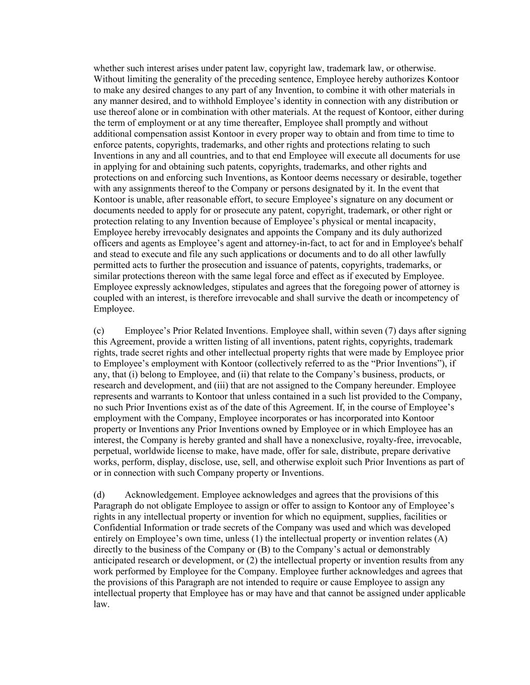 whether such interest arises under patent law, copyright law, trademark law, or otherwise. Without limiting the generality of the preceding sentence, Employee hereby authorizes Kontoor to make any desired changes to any part of any Invention, to combine it with other materials in any manner desired, and to withhold Employee’s identity in connection with any distribution or use thereof alone or in combination with other materials. At the request of Kontoor, either during the term of employment or at any time thereafter, Employee shall promptly and without additional compensation assist Kontoor in every proper way to obtain and from time to time to enforce patents, copyrights, trademarks, and other rights and protections relating to such Inventions in any and all countries, and to that end Employee will execute all documents for use in applying for and obtaining such patents, copyrights, trademarks, and other rights and protections on and enforcing such Inventions, as Kontoor deems necessary or desirable, together with any assignments thereof to the Company or persons designated by it. In the event that Kontoor is unable, after reasonable effort, to secure Employee’s signature on any document or documents needed to apply for or prosecute any patent, copyright, trademark, or other right or protection relating to any Invention because of Employee’s physical or mental incapacity, Employee hereby irrevocably designates and appoints the Company and its duly authorized officers and agents as Employee’s agent and attorney-in-fact, to act for and in Employee's behalf and stead to execute and file any such applications or documents and to do all other lawfully permitted acts to further the prosecution and issuance of patents, copyrights, trademarks, or similar protections thereon with the same legal force and effect as if executed by Employee. Employee expressly acknowledges, stipulates and agrees that the foregoing power of attorney is coupled with an interest, is therefore irrevocable and shall survive the death or incompetency of Employee. (c) Employee’s Prior Related Inventions. Employee shall, within seven (7) days after signing this Agreement, provide a written listing of all inventions, patent rights, copyrights, trademark rights, trade secret rights and other intellectual property rights that were made by Employee prior to Employee’s employment with Kontoor (collectively referred to as the “Prior Inventions”), if any, that (i) belong to Employee, and (ii) that relate to the Company’s business, products, or research and development, and (iii) that are not assigned to the Company hereunder. Employee represents and warrants to Kontoor that unless contained in a such list provided to the Company, no such Prior Inventions exist as of the date of this Agreement. If, in the course of Employee’s employment with the Company, Employee incorporates or has incorporated into Kontoor property or Inventions any Prior Inventions owned by Employee or in which Employee has an interest, the Company is hereby granted and shall have a nonexclusive, royalty-free, irrevocable, perpetual, worldwide license to make, have made, offer for sale, distribute, prepare derivative works, perform, display, disclose, use, sell, and otherwise exploit such Prior Inventions as part of or in connection with such Company property or Inventions. (d) Acknowledgement. Employee acknowledges and agrees that the provisions of this Paragraph do not obligate Employee to assign or offer to assign to Kontoor any of Employee’s rights in any intellectual property or invention for which no equipment, supplies, facilities or Confidential Information or trade secrets of the Company was used and which was developed entirely on Employee’s own time, unless (1) the intellectual property or invention relates (A) directly to the business of the Company or (B) to the Company’s actual or demonstrably anticipated research or development, or (2) the intellectual property or invention results from any work performed by Employee for the Company. Employee further acknowledges and agrees that the provisions of this Paragraph are not intended to require or cause Employee to assign any intellectual property that Employee has or may have and that cannot be assigned under applicable law.